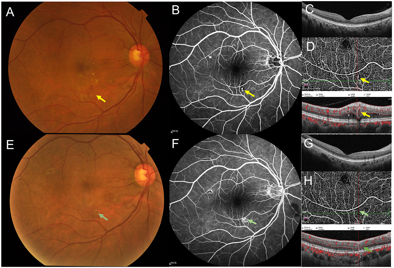Figure 2. Follow-up at 1.5 years after initial presentation, color fundus photography showed almost complete resolution of the ring-shaped hard exudates (A). Fundus fluorescein angiography (FFA) revealed an irregular, punctate hyperfluorescent lesion [(B), yellow arrow]. Optical coherence tomography (OCT) imaging through the fovea demonstrated complete resolution of subretinal fluid (SRF) with few intraretinal hard exudates (C). Optical coherence tomography angiography (OCTA) continued to show an anomalous, sausage-shaped dilated blood flow external to the inferior vascular arcade, with a significantly increased lumen diameter compared to Figure 1H on the cross-sectional OCT [(D), yellow arrow]. Follow-up at nearly 3 years after initial presentation, color fundus photography showed complete resolution of the ring-shaped hard exudates (E). FFA demonstrated fluorescein staining at the site of the original lesion [(F), green arrow]. OCT imaging through the fovea revealed complete resolution of SRF without any intraretinal hard exudates (G). OCTA showed complete disappearance of the anomalous, sausage-shaped dilated blood flow signal, and a corresponding cross-sectional OCT scan confirmed complete disappearance of the oval lesion [(H), green arrow].