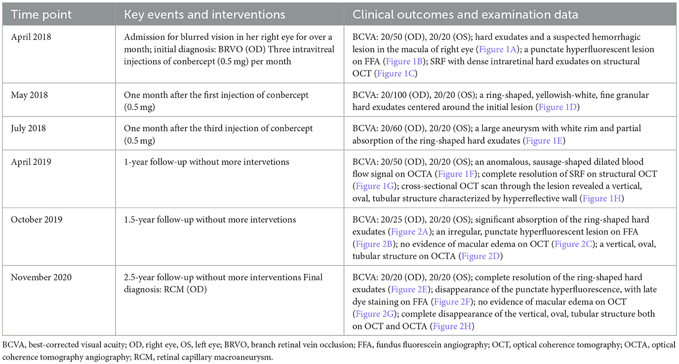 Diagnostic assessment: The initial diagnosis of BRVO was challenged by several key findings. First, the patient exhibited no characteristic retinal hemorrhages typically associated with BRVO. Second, neither FFA nor OCTA revealed significant areas of non-perfusion, which are commonly linked to BRVO-related large retinal capillary aneurysms. Third, unlike the macular edema typically seen in BRVO, the patient's visual acuity did not improve following three intravitreal anti-VEGF injections, and the annular hard exudates became more pronounced. Notably, the center of these exudates often corresponds to the location of underlying retinal vascular abnormalities. In this case, OCTA provided definitive evidence by clearly visualizing sausage-shaped dilated capillaries and confirming the absence of surrounding non-perfusion. These findings collectively supported the conclusion that the abnormal retinal capillary aneurysm was idiopathic rather than secondary to BRVO, leading to a final diagnosis of RCM. The clinical timeline for the patient was summarized in Table 1.