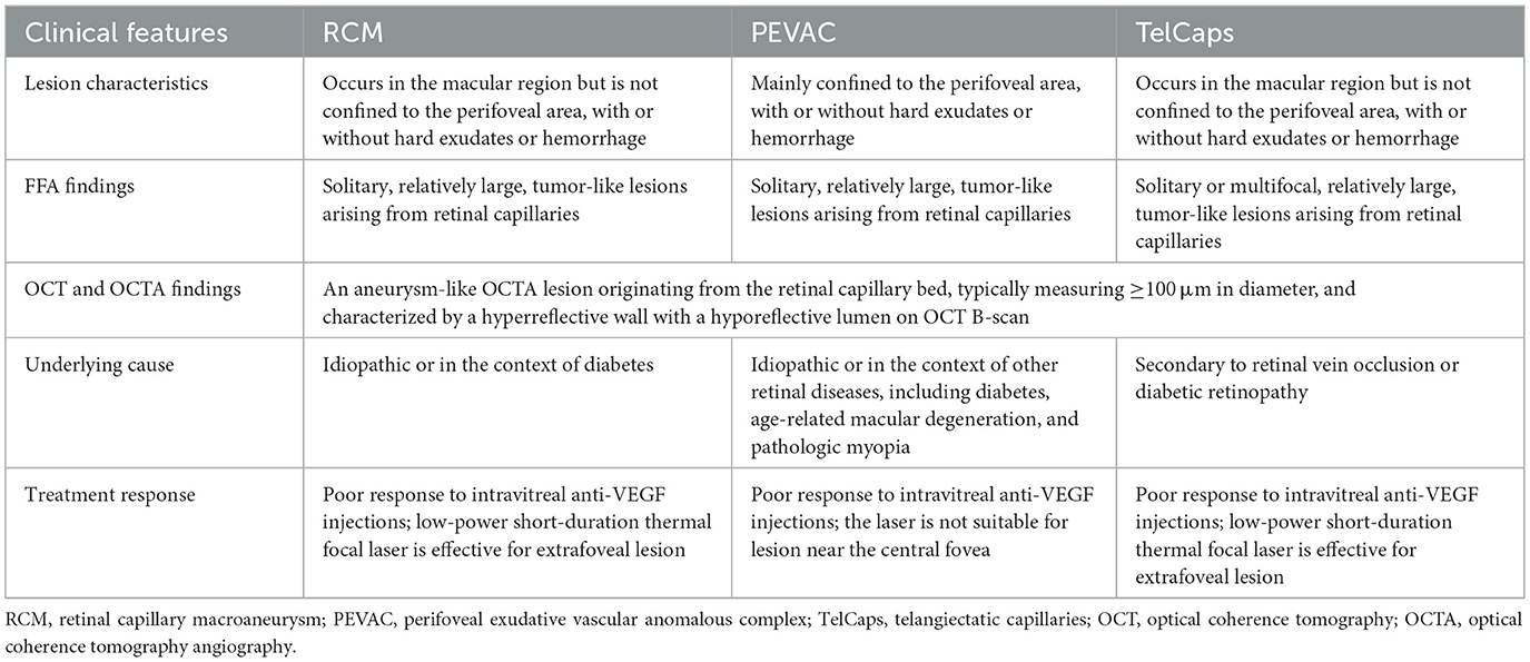 Unlike TelCaps, which are often used to describe retinal capillaries dilation with underlying retinal vascular diseases like DR or RVO (11–13), RCMs and PEVAC are generally considered isolated, benign, and relatively large tumor-like growths of the retinal microvasculature. The primary distinction between the two lies in the location, as RCMs can occur anywhere in the macular region, not being confined to the perifoveal area [7]. Both terms share many clinical similarities, including a predilection for eyes without a clear underlying etiology, typically presenting as solitary, vascular tumor-like lesions. Additionally, both terms demonstrate a poor response to intravitreal anti-VEGF injections and may or may not be accompanied by hard exudates (1, 28). Besides, previous studies have shown that PEVAC may remain stable or even spontaneously resolve over time (29), whereas RCMs tend to increase in size (1). Here, we present the first reported case of spontaneous remission in an RCM. The clinical features of RCM, PEVAC, and TelCaps are listed in Table 2.