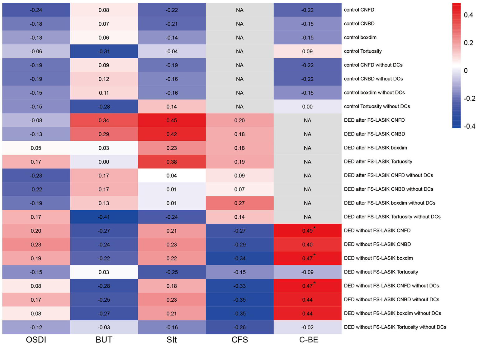 Correlations of ocular surface symptoms and signs with corneal nerve morphology and quantitative metrics in study groups. The heatmap shows the value of the correlation coefficient between ocular surface symptoms and signs (OSDI, FBUT, CFS, SIt, C-BE) with corneal nerve morphology and quantitative metrics (CNFD, CNBD, boxdim, and tortuosity) when DCs were included and excluded among the control group, DED after FS-LASIK group, and DED without FS-LASIK group. *p < 0.05. NA, not available.