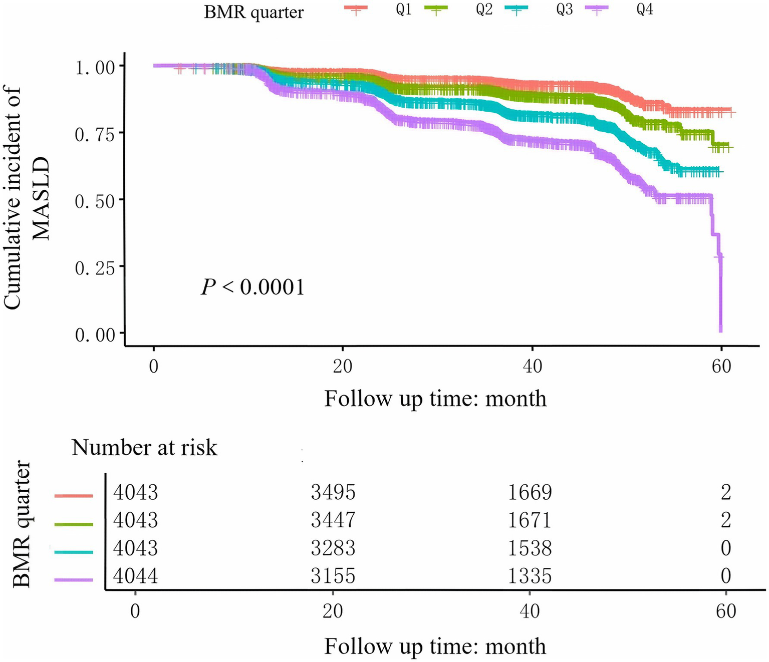 Kaplan–Meier curves of the cumulative incidence of new-onset MASLD stratified by BMR quartile.