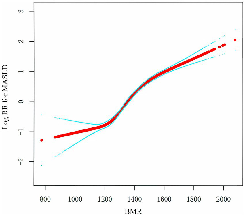 MR refers to the minimum energy expenditure required to maintain life activities at rest, and it is influenced by various factors, including age, sex, muscle mass, endocrine status, and genetics (34). It has previously been used to assess metabolic-related diseases such as hyperthyroidism, hypothyroidism, and diabetes (35). However, with a deeper understanding of BMR, researchers have reported that BMR is a risk factor for various diseases. A large-scale study (n = 534,045) using Mendelian randomization analysis revealed an association between BMR and cardiometabolic risk factors (36). Similarly, Li reported that BMR is associated with an increased risk of aortic aneurysm and atrial fibrillation/flutter (37). A higher BMR increases the risk of cancer, and although the specific mechanisms are not yet clear, BMR, as a potential modifiable target for cancer prevention, warrants further investigation (38, 39). Some researchers have even reported that BMR is related to lifespan (40). The onset and progression of MASLD are closely related to energy metabolism disorders, and BMR accounts for 60–70% of total daily energy expenditure (41), playing a crucial role in energy balance. Therefore, we hypothesize that there is a connection between BMR and MASLD (42).