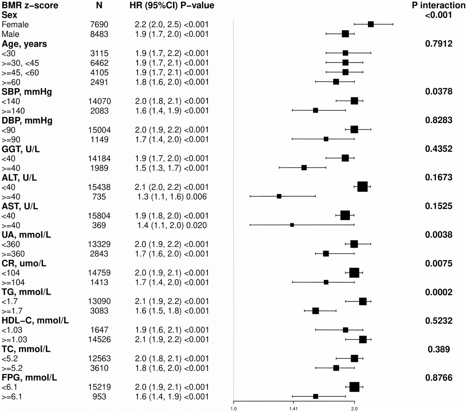 Subgroup analyses for the associations between BMR and MASLD were adjusted for sex, age, SBP, DBP, GGT, ALT, AST, UA, CR, TG, HDL-C, TC, and FPG, with the exception of the stratified variable.