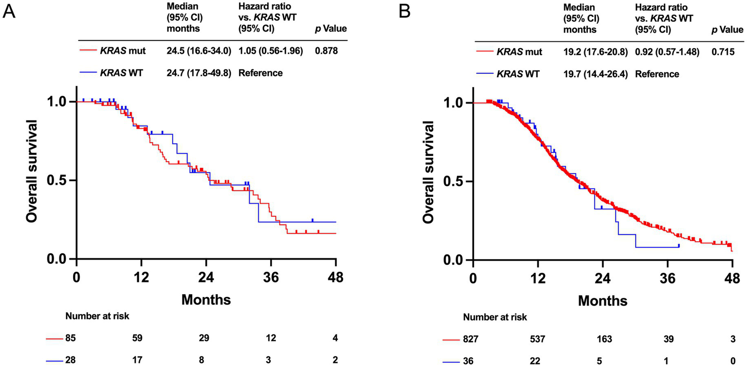 Kaplan–Meier analysis of overall survival (OS) by KRAS mutation status in PDAC patients with homologous recombination DNA repair (HRR) alteration group (A) and with HRR wild-type (WT) group (B).