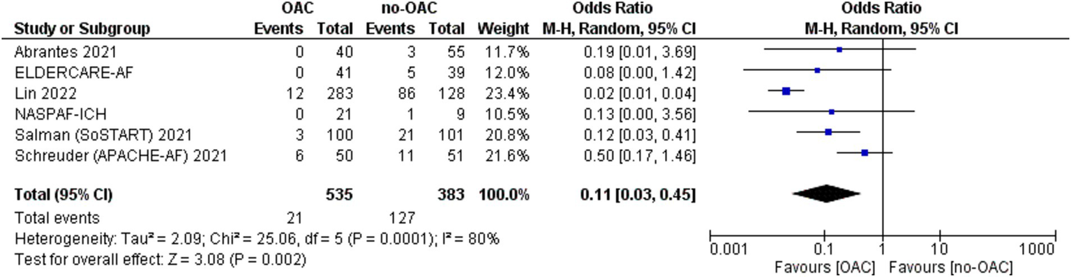 A major cardiovascular ischemic event was reported in six of the included studies (Figure 3). It was counted in 21 out of 535 patients in the OAC group and 127 out of 383 patients in the no-OAC group. There was a lower major cardiovascular ischemic event in the OAC group [OR = 0.11; CI 95% (0.03, 0.45); p = 0.002]. There was a low heterogeneity among the different studies (Tau2 = 2.53).