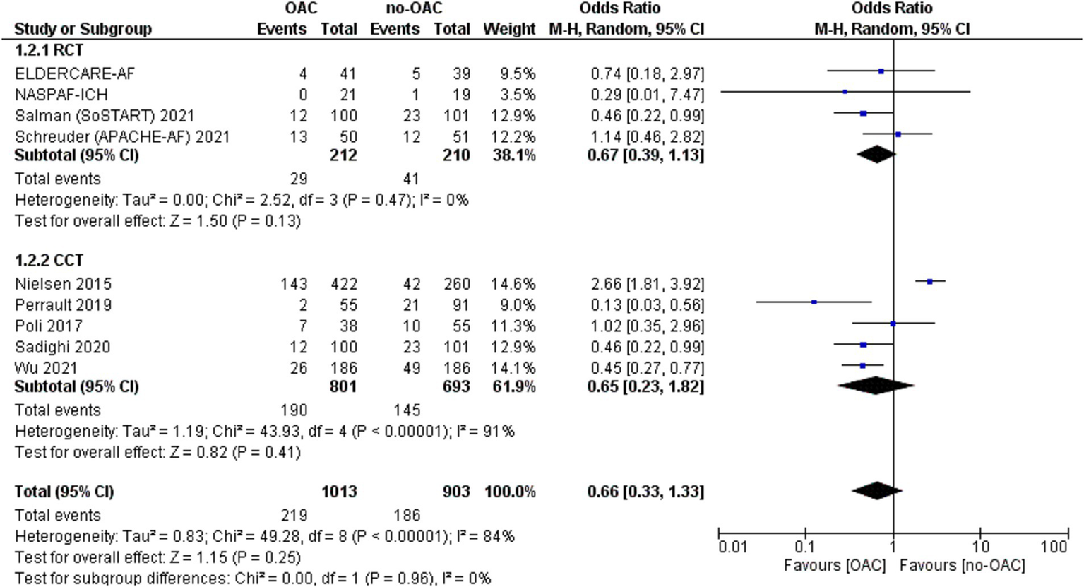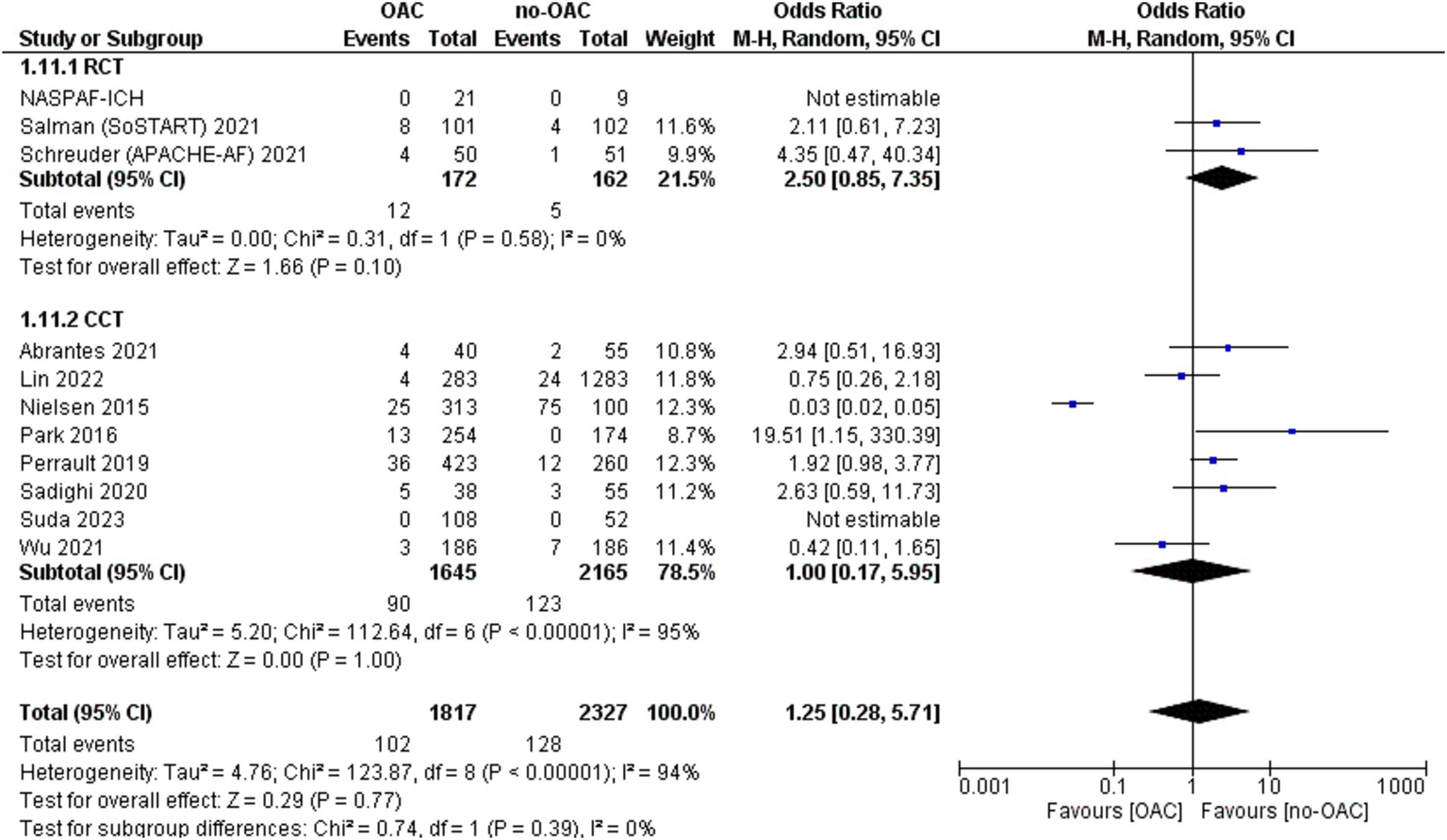 The ICH recurrence was reported in 11 included studies (Figure 7). It was counted in 102 out of 1817 patients in the OAC group and 128 out of 2,327 patients in the no-OAC group. There was no difference between the two groups in terms of ICH recurrence [OR = 1.25; CI 95% (0.28, 5.71); p = 0.77] even in the subgroup analysis of RCT (p = 0.10) and CCT (p = 1.00). There was a low heterogeneity among the different studies (Tau2 = 4.76). There was no difference in the location of ICH in terms of mortality.