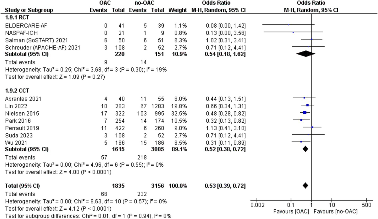 Ischemic stroke was reported in 11 included studies (Figure 2). It was counted in 66 out of 1835 patients in the OAC group and 232 out of 3,156 patients in the no-OAC group. There was a lower rate of ischemic stroke in the OAC group [OR = 0.53; CI 95% (0.39, 0.72); p < 0.001]. In the subgroup analysis, there was no difference in the RCT subgroup [OR = 0.54; CI 95% (0.18, 1.62); p = 0.72] and statistically lower ischemic stroke rate in the CCT subgroup [OR = 0.52; CI 95% (0.38, 0.72); p < 0.001]. There was no heterogeneity among the different studies.
