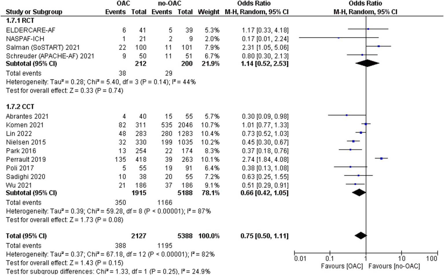 The mortality rate was reported in 13 studies (Figure 4). It was counted 388 out of 2,127 patients in the OAC group and 1,166 out of 8,188 in the no-OAC group. There was no difference between the two groups in terms of mortality [OR = 0.75; CI 95% (0.50, 1.11); p = 0.15], even in the subgroup analysis of RCT (p = 0.74) and CCT (p = 0.08). There was a low heterogeneity among the different studies (Tau2 = 0.37). There was no difference according to the location of ICH in terms of mortality.