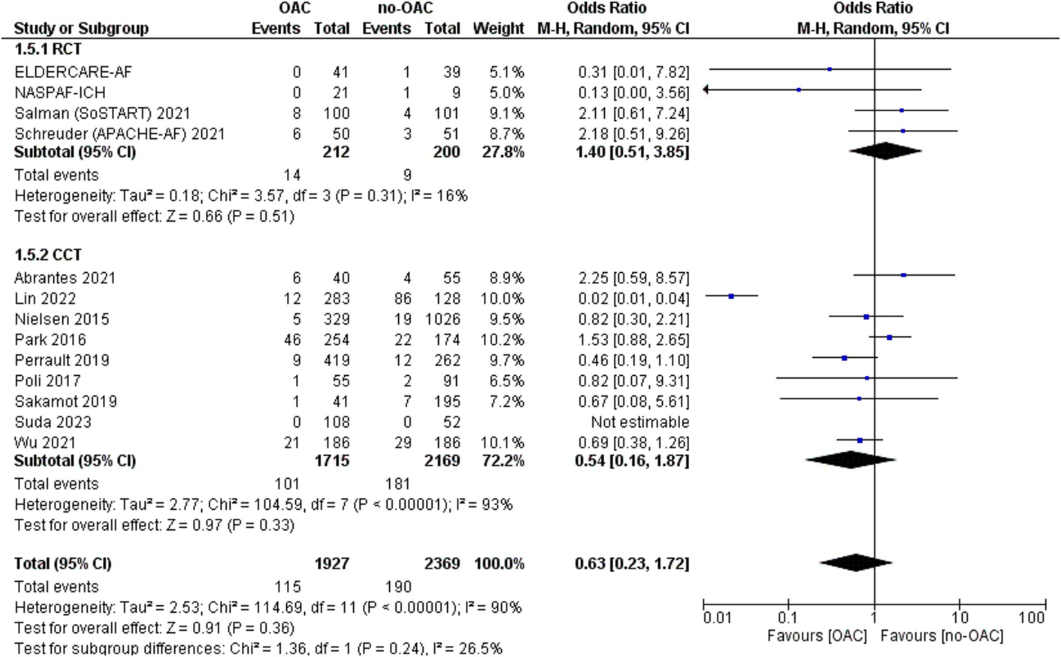 The major bleeding was reported in 13 included studies (Figure 5). It was counted in 115 out of 1927 patients in the OAC group and 190 out of 2,369 patients in the no-OAC group. There was no difference between the two groups in terms of major bleeding [OR = 0.63; CI 95% (0.23, 1.72); p = 0.36], even in the subgroup analysis of RCT (p = 0.0.51) and CCT (p = 0.33). There was a low heterogeneity among the different studies (Tau2 = 2.53).