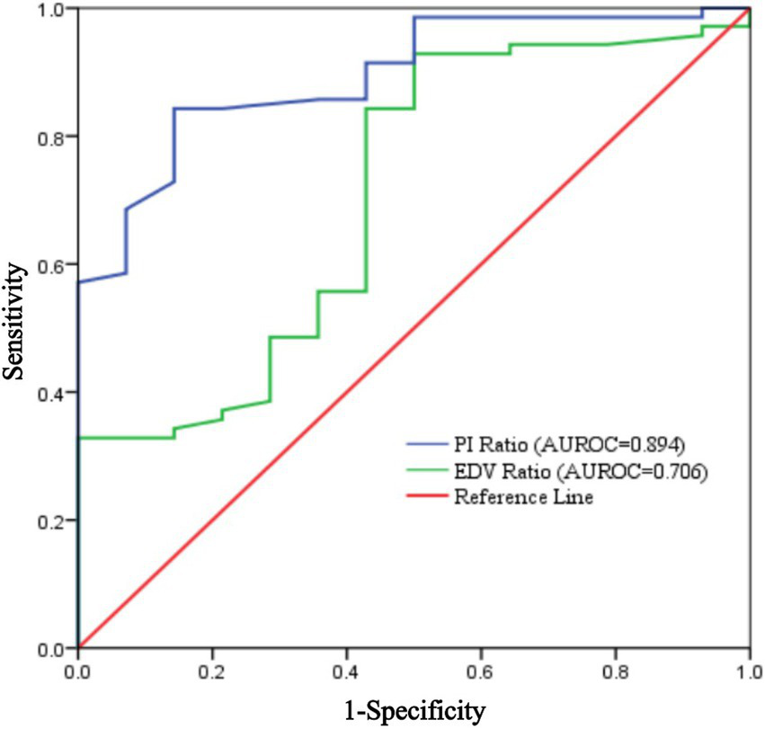 Of 89 patients, 3 were excluded due to data loss and 2 withdrew, leaving 84 patients. Of these, 70 (83.3%) had successful blocks. In the successful group, both PI and EDV ratios on the blocked side significantly increased 5 min after the procedure. The PI ratio at 5 min had an AUROC of 0.894 (95% CI: 0.816–0.972), with a threshold of 1.22, sensitivity of 84.3%, and specificity of 85.7%. The EDV ratio had an AUROC of 0.706 (95% CI: 0.553–0.860), with a threshold of 1.32, sensitivity of 92.9%, and specificity of 50%. At 10 min, the PI ratio for assessing ISBPB impact had an AUROC of 0.901 (95% CI: 0.828–0.974), with a threshold of 1.4, sensitivity of 74.3%, and specificity of 92.9%. The AUROC for the EDV ratio was 0.799 (95% CI: 0.6788–0.921) with a threshold of 1.54, sensitivity of 92.9%, and specificity of 57.1%. The PI ratio at 5 min had a significantly higher AUROC than the EDV ratio, but no significant difference was found between PI ratios at 5 and 10 min.