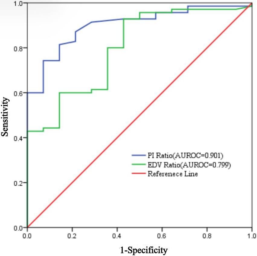 To evaluate the effectiveness of ultrasound-guided ISBPB, receiver operating characteristic (ROC) curves were plotted for the PI ratio and EDV ratio in response to the block’s efficacy. Sensitivity and specificity were calculated based on the point with the highest Youden index on the ROC curve, along with the diagnostic threshold, AUC, and 95% confidence interval (CI). The DeLong test was used to compare the predictive value of the AUCs for the PI and EDV ratios. A p value of <0.05 was considered statistically significant.