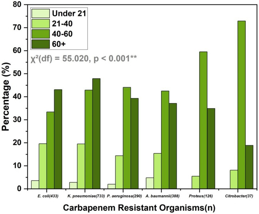 The age distribution of CROs shows a significant age-related difference in prevalence [χ2(df) = 55.020, p < 0.001**]. The highest prevalence of carbapenem-resistant E. coli and K. pneumoniae is in individuals over 60 years, accounting for 43.1 and 47.9%, respectively, (Figure 4). Similarly, P. aeruginosa and A. baumannii are most common in the 40–60 and over 60 age groups. Proteus shows a markedly high prevalence in the 40–60 age group (59.5%), while Citrobacter is predominantly found in the 40–60 age group (72.9%). This data underscores the higher prevalence of CROs in older age groups, particularly those over 60 years old.