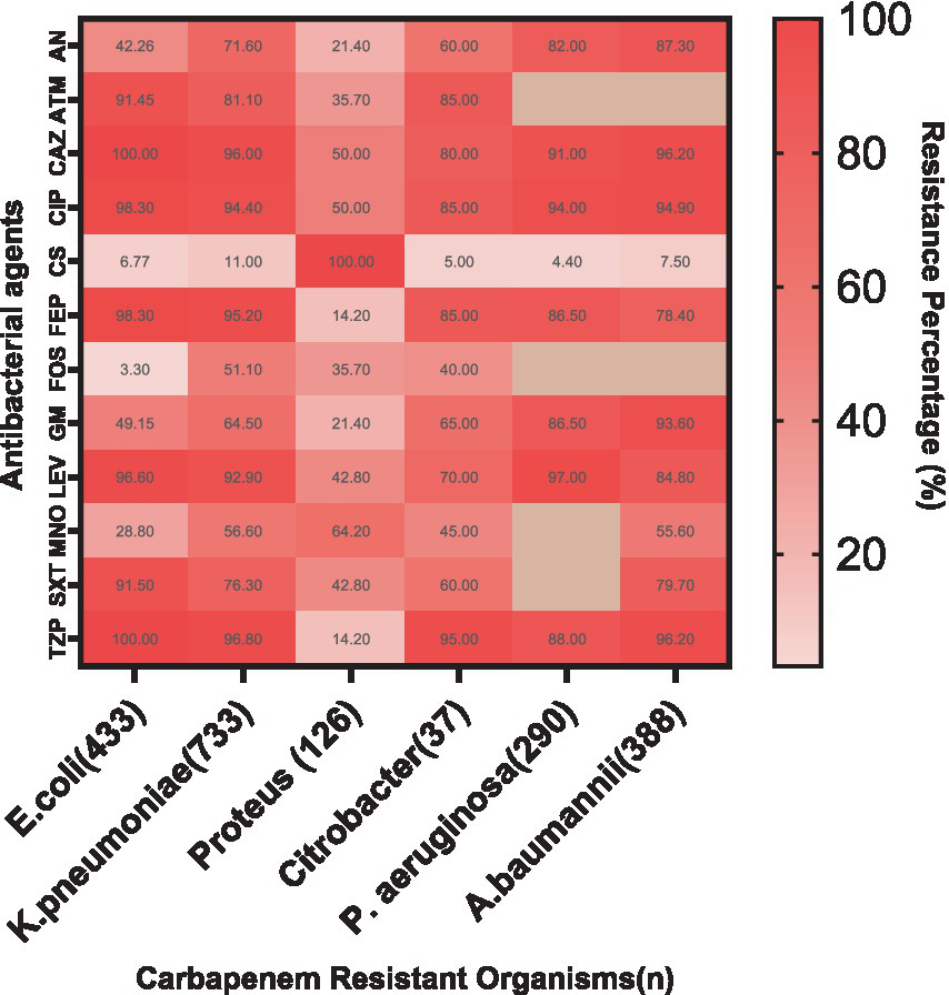 Resistance patterns of CROs to various antibacterial agents. The heat map illustrates high resistance levels in E. coli, K. pneumoniae, P. aeruginosa, and A. baumannii to multiple antibiotics, with lower resistance observed for Colistin, Minocycline and Fosfomycin. AN, Amikacin; ATM, Aztreonam; CAZ, Ceftazidime; CIP, Ciprofloxacin; CS, Colistin; FEP, Cefepime; FOS, Fosfomycin; GM, Gentamicin; LEV, Levofloxacin; MNO, Minocycline; SXT, Trimethoprim/Sulfamethoxazole; TZP, Piperacillin/Tazobactam.