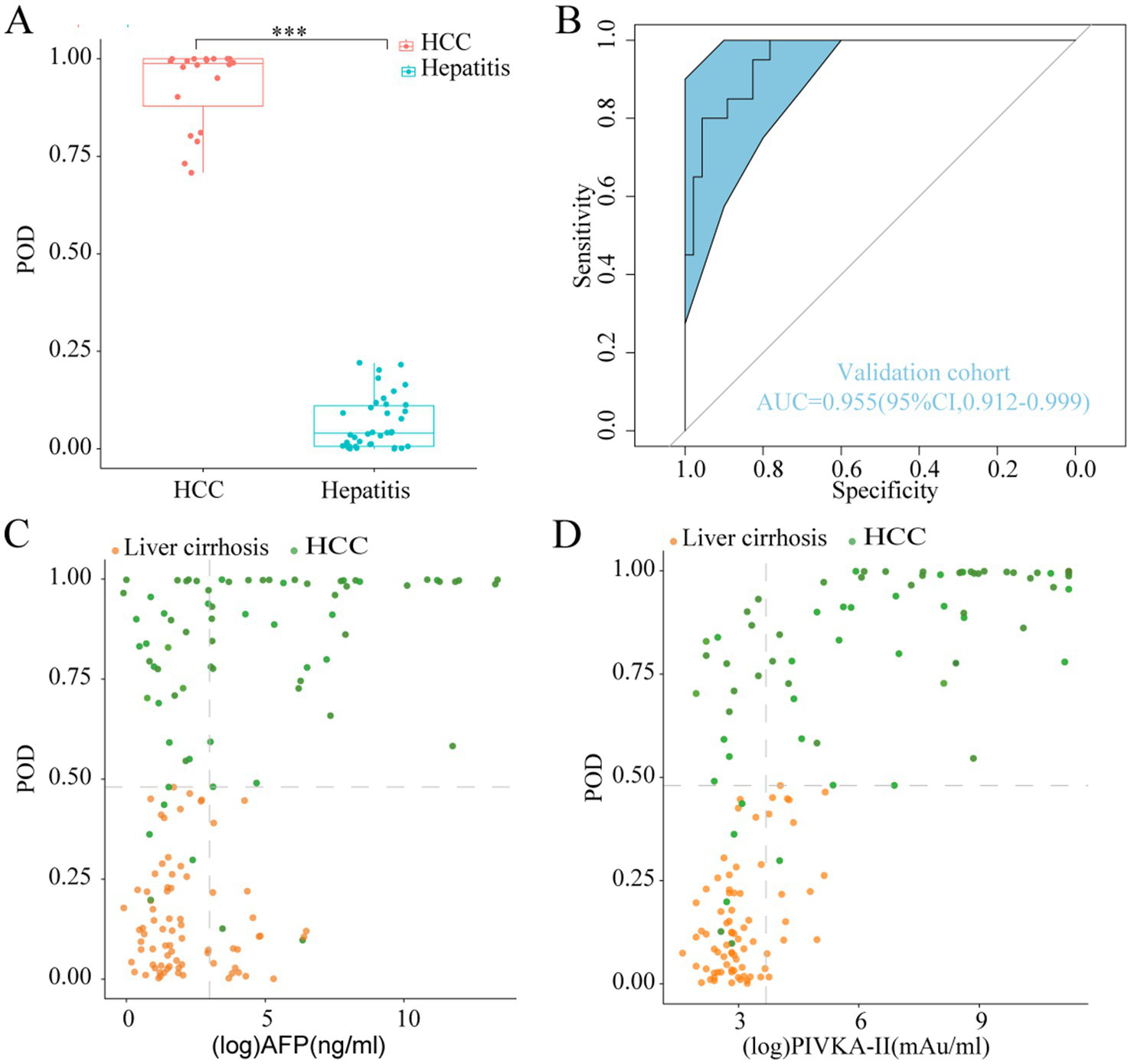 Validation diagnosis and the complementary role for the diagnosis of AFP-negative and PIVKA-II-negative HCC patients. (A) The POD value was significantly increased in the HCC samples versus the hepatitis samples in the validation phase (p < 0.001). (B) The model performed robustly in validation phase, which achieved an AUC value of 0.955 (95% CI 0.912 to 0.999) between HCC and hepatitis cohorts. (C,D) Performance of the model in the diagnosis of AFP-negative and PIVKA-II-negative HCC patients. POD, probability of disease; AUC, area under the curve; HCC, hepatocellular carcinoma; AFP, alpha-fetoprotein; PIVKA-II, protein induced by vitamin K absence or antagonist-II.