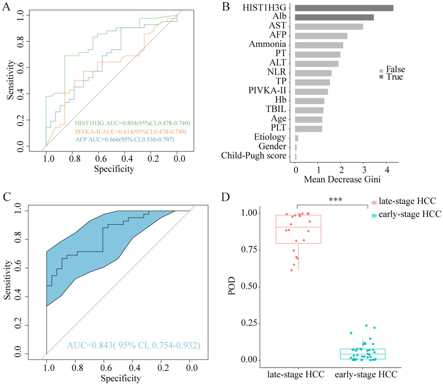 Abilities of HIST1H3G in identifying early HCC. (A) Diagnostic outcomes for serum HIST1H3G, PIVKA-II and AFP in the diagnosis of early HCC. AUC (HIST1H3G) > AUC (AFP) > AUC (PIVKA-II). (B)HIST1H3G and Alb were selected as the optimal marker set. (C) The POD index achieved an AUC value of 0.843 with 95% CI of 0.754 to 0.932 between early-stage HCC and late-stage HCC cohorts. (D) The POD value was significantly increased in the late-stage HCC samples versus the early-stage HCC samples (p < 0.001). AUC, the area under the ROC curve; POD, probability of disease; HCC, hepatocellular carcinoma; Alb, albumin; AST, aspartate aminotransferase; AFP, alpha-fetoprotein; PT, prothrombin time; ALT, alanine aminotransferase; NLR, neutrophil to lymphocyte ratio; TP, total protein; PIVKA-II, protein induced by vitamin K absence or antagonist-II; Hb, hemoglobin; TBIL, total bilirubin; PLT, platelet.