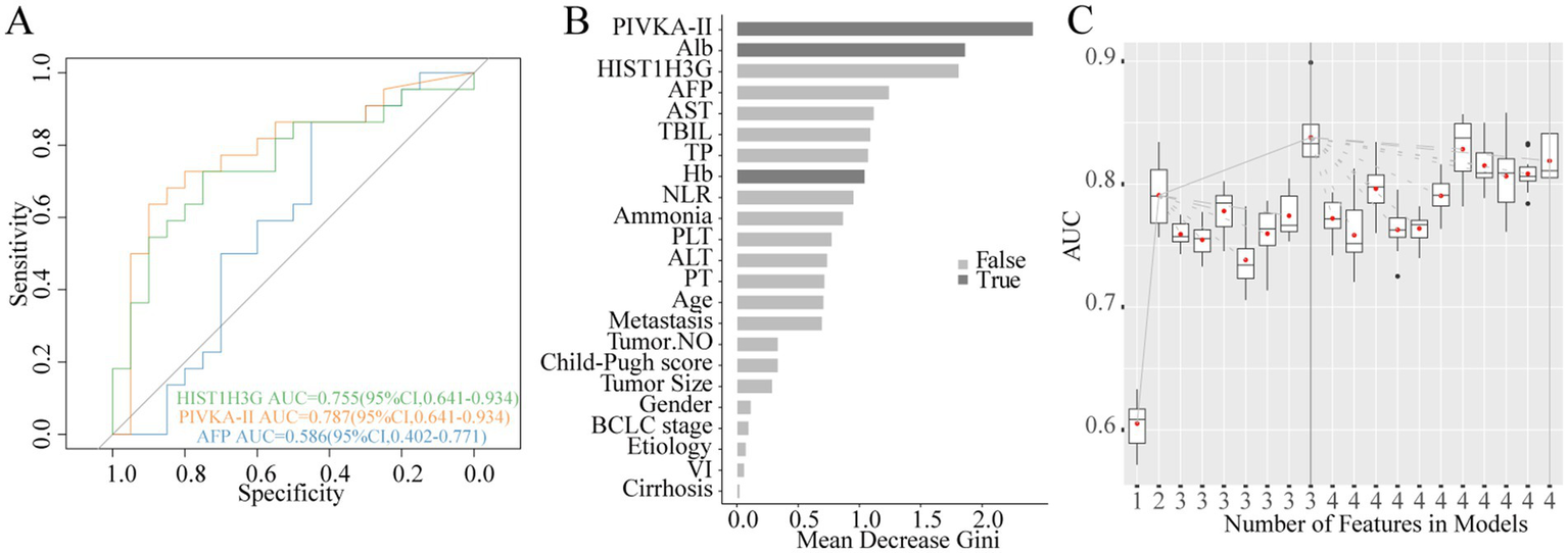 Each biomarker exhibited distinct patterns of serum level distribution and range. We conducted an analysis of the correlation coefficients to ascertain statistically relationships between the biomarkers. The correlation coefficient between AFP and HIST1H3G was 0.4 (p < 0.05) (Supplementary Figure 1A), whereas the correlation between PIVKA-II and HIST1H3G was 0.58 (p < 0.05) (Supplementary Figure 1B). Furthermore, a correlation coefficient of 0.59 was observed between AFP and PIVKA-II (p < 0.05) (Supplementary Figure 1C). The findings indicated a weak correlation between HIST1H3G and both AFP and PIVKA-II, implying that HIST1H3G may be utilized independently as an adjunctive diagnostic tool for HCC patients.