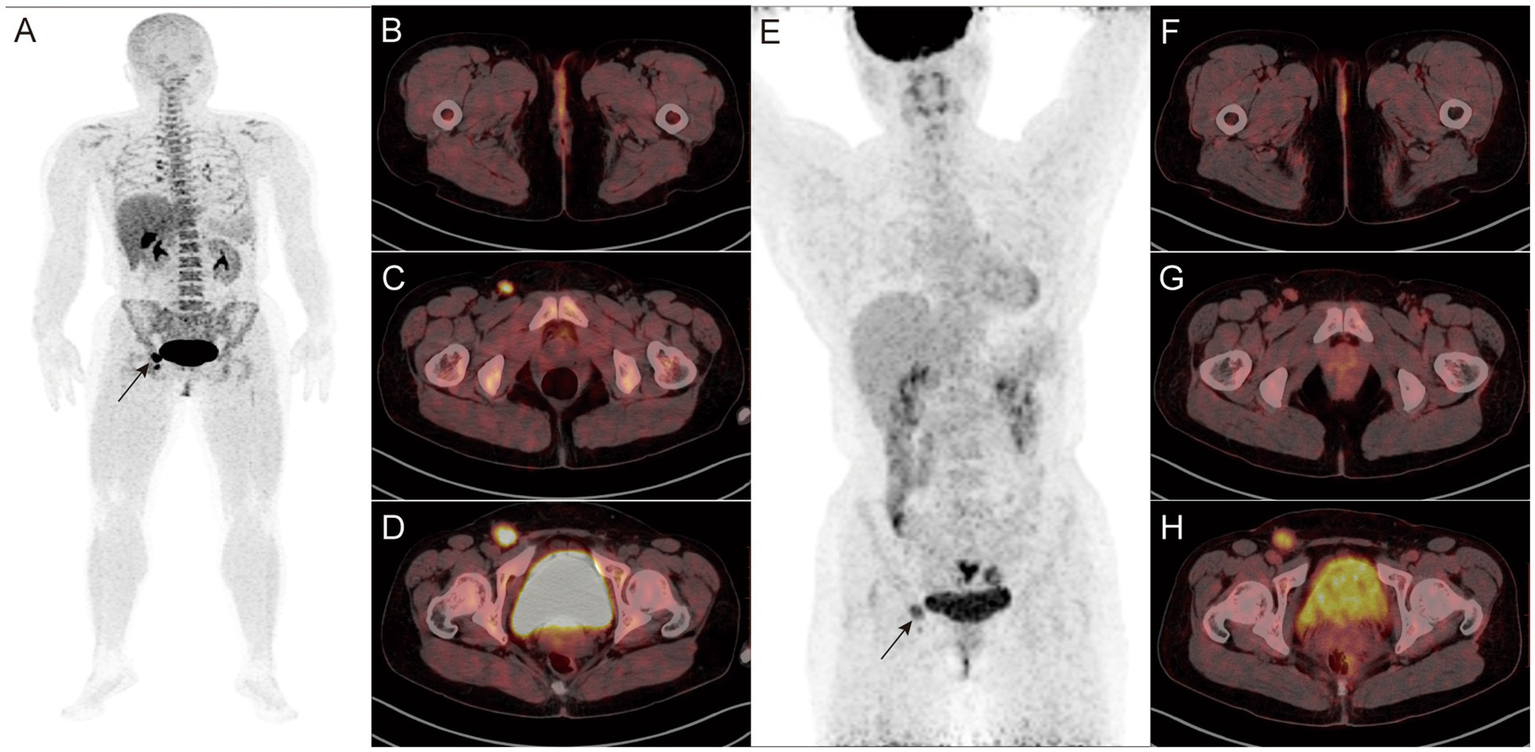 Figure 2. A-H: Findings in a 45-year-old female patient who underwent surgery for external vulvar melanoma 1 year before the start of the study. 18F-P3BZA PET/CT MIP (A) showing a radioactive accumulation shadow in the right inguinal region (black arrow). Axial PET/CT (B–D) showing no significant morphological changes or abnormal uptake in the surgical area, with two enlarged lymph nodes with intense radioactive uptake in the right inguinal region (SUVmax: 7.2 and 14.4, respectively). (E–H) 18F-FDG PET/CT images of the patient during the same period. 18F-FDG PET/CT MIP (E) showing a radioactive accumulation shadow in the right inguinal region (black arrow). Axial PET/CT (F–H) showing no abnormalities in the surgical area. The radioactive uptake of the two lymph nodes in the right inguinal region is mild to moderate (SUVmax: 3.6 and 5.8, respectively).