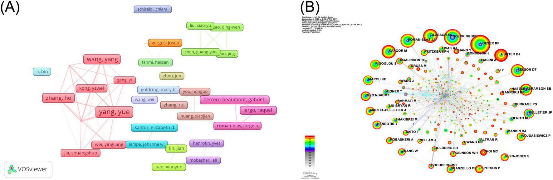 A total of 752 studies were included in this analysis, and the results demonstrated an overall increasing trend in the number of published papers and citation frequency over the period 2004−2023. China leads in terms of the number of publications, with 387 publications, followed by the United States (118), and Japan (45). The institutions with the highest number of publications were China Medical University (28) and The Second Affiliated Hospital of Wenzhou Medical University (Yuying Children’s Hospital) (24). The most frequently occurring keywords were “articular cartilage,” “inflammation,” “activation,” and “expression.” Furthermore, recent keywords with high research intensity included “histopathology,” “mesenchymal stem cells,” “subchondral bone,” and “hip.” Toll-like receptor 4 (TLR4), monosodium iodoacetate (MIA), and high-performance anion-exchange chromatography with pulsed amperometric detection (HPAE-PAD) were popular research topics.