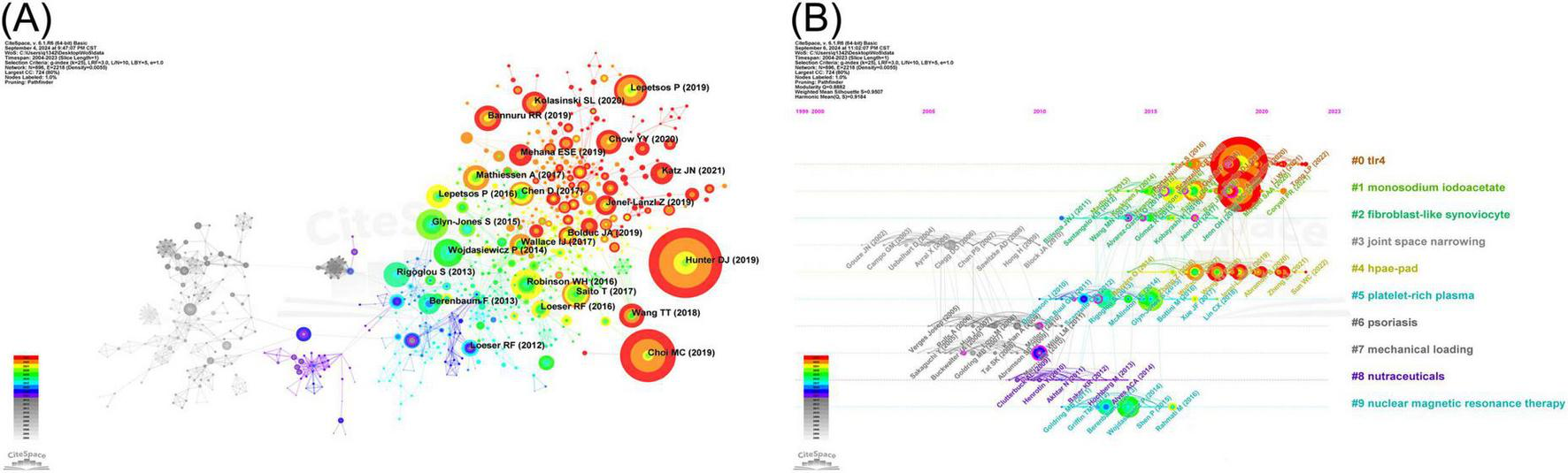 The top three journals in terms of article output were Osteoarthritis and Cartilage (31 articles), International Journal of Molecular Sciences (28 articles), and International Immunopharmacology (21 articles). Notably, these three journals had an IF exceeding 4, reflecting their prominence in the field. The cited journal information was extracted using CiteSpace software, and the 10 most frequently cited journals are presented in Table 6. The top three most frequently cited journals, in order, are Osteoarthritis and Cartilage (671), Arthritis & Rheumatism (ARTHRITIS RHEUM-US) (498), and Arthritis Research & Therapy (442). Nature Reviews Rheumatology had the highest impact factor among the top 10 most cited journals, with an IF of 29.4.