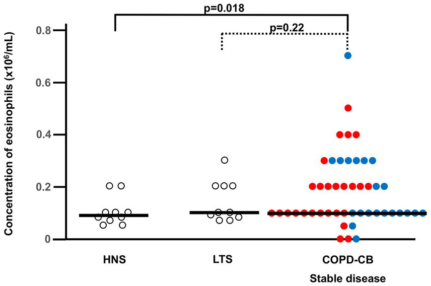 The blood concentrations of eosinophils during stable disease in current long-term smokers with COPD and chronic bronchitis (COPD-CB) in comparison with healthy never-smokers (HNS) and current long-term tobacco smokers without COPD and chronic bronchitis (LTS). Patients in the COPD-CB group with exacerbations of COPD are represented by red dots and those with no exacerbations of COPD are represented by blue dots. The concentrations of eosinophils are presented as individual values with medians (bold lines). The p-value was determined using Kruskal-Wallis test followed by Mann–Whitney U-test.