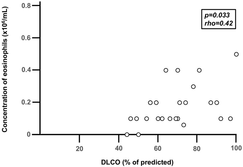 During stable disease in the COPD-CB group, the blood concentrations of eosinophils were higher than in the HNS group, while the COPD-CB group and the LTS group displayed similar concentrations (Figure 2). More specifically, 12 out of 47 patients (26%) with COPD and CB displayed an eosinophil concentration of 0.3 × 106/mL or higher (Figure 2). Notably, there was no statistically significant correlation between the blood concentrations of eosinophils during stable disease and the number of (future) exacerbations in the COPD-CB group during the study (p = 0.14; rho = 0.30; n = 26; Spearman Rank Correlation test, data not shown). Nor did patients with two or more future exacerbations display any statistically significant difference in blood concentrations of eosinophils during stable disease in comparison with those who had one future exacerbation only (0.2 vs. 0.1 × 106 cells/L; p = 0.24; n = 26; Mann–Whitney U-test, data not shown). During stable disease in the COPD-CB group, the concentrations of ECP tended to be somewhat higher and IL-4 tended to be lower than the control groups, even if these changes were not statistically significant (Table 2). For patients in the COPD-CB group who were treated with ICS and delivered exacerbation samples, there was a trend toward a lower eosinophil concentration during stable disease, although without statistical significance (Figure 1). During stable disease in the COPD-CB group, we detected no correlations between concentrations of eosinophils, ECP or IL-4 in blood, on the one hand, and FEV1 (% predicted) or the FEV1/FVC ratio, on the other hand (Supplementary Figures 1A,B, 2A,B, 3A,B). Under these conditions, however, we did detect a positive correlation between the concentration of eosinophils in blood and gas diffusion capacity (DLCO % of predicted; Figure 3). No matching correlations were detected for either concentrations of ECP or IL-4 in blood under these conditions (Supplementary Figures 2C, 3C). We failed to detect any correlation between the concentration of eosinophils and partial pressure of oxygen in the COPD-CB group during stable disease (Supplementary Figure 4).