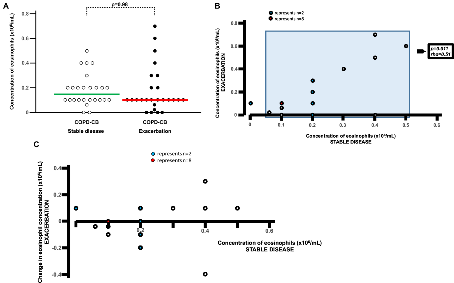In conclusion, our study on a carefully characterized cohort of patients with COPD and chronic bronchitis but no allergy forwards clinical evidence that, by average, there is no additional, systemic eosinophil mobilization during exacerbations in the clinical phenotype that was examined. Thus, in this common and important phenotype, the immunological rationale for targeting systemic eosinophils during exacerbations remains unaccounted for. We think that this key finding motivates verifications studies on systemic and local eosinophil mobilization during exacerbations in large cohorts of COPD patients stratified for both chronic bronchitis and allergy.