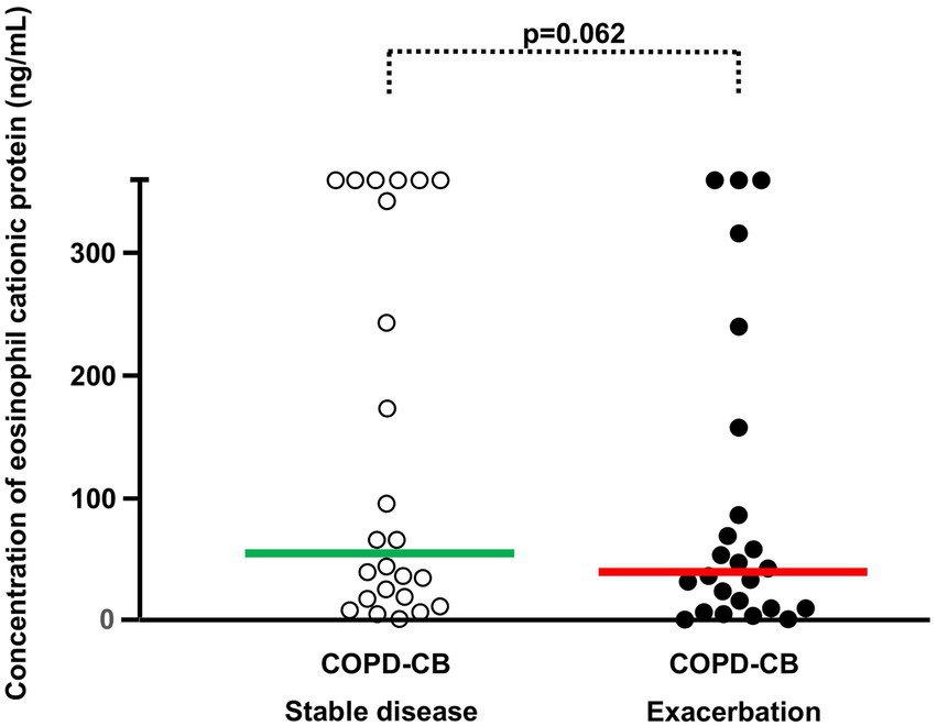 During the last decade, it has been recognized that COPD may include several immunological endotypes, although there is limited understanding of how these relate to clinical phenotypes (1–5). However, it is known that the clinical phenotype of COPD with CB is signified by frequent exacerbations, associated with increased decline in lung function and poor long-term prognosis (1, 6–8). It is also known that exacerbations are especially common in the clinical phenotype with concomitant chronic bronchitis (9, 10). In addition, there is a growing body of evidence that the clinical phenotype with frequent exacerbations is associated with the endotype with enhanced blood concentrations of eosinophilic granulocytes (eosinophils) during stable disease, and there is published evidence that the concentrations of blood eosinophils mirror those of airway eosinophils (1, 11, 12). Interestingly, the endotype with these “enhanced eosinophil concentrations” responds favorably to inhaled corticosteroids (ICS) (1, 4, 13–19) and this has been perceived as an argument for targeting systemic eosinophil mobilization with medication to prevent exacerbations in COPD. However, most published studies on blood eosinophils in COPD have examined this biomarker during stable disease, and the present literature provides limited and conflicting information on systemic eosinophil mobilization during COPD exacerbations in patient populations of mixed phenotypes (13, 20). Despite several large cohort studies on blood eosinophils in COPD, there is only one recent study by Kang et al. that have addressed how the moderately enhanced systemic eosinophil mobilization in stable COPD relates to phenotypes having allergy, a comorbidity that is believed to affect a minority (20 to 25%) of the patients with COPD (21–23). Notably, the study by Kang et al. demonstrates that during stable disease, COPD patients with allergy have higher concentrations of blood eosinophils than those without allergy. Additionally, clinical trials of antibodies targeting eosinophil-mobilizing cytokine signaling indicate that inhibiting systemic eosinophil mobilization prevents from exacerbations in COPD, provided that the patients display blood concentrations of eosinophils above a critical threshold within the normal range or above (24, 25). Thus, there is clinical evidence compatible with modest systemic eosinophil mobilization not only being associated with but also mediating COPD exacerbations, but there is no conclusive information on systemic eosinophil mobilization per se during exacerbations in COPD patients with chronic bronchitis without allergy.