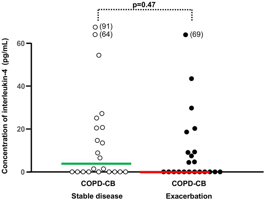 The blood concentrations of interleukin (IL)-4 during stable disease and exacerbations in 22 current long-term smokers with exacerbations of COPD and chronic bronchitis (COPD-CB). The data are presented as individual values with medians (bold lines). The p-value was determined using Wilcoxon signed rank test.