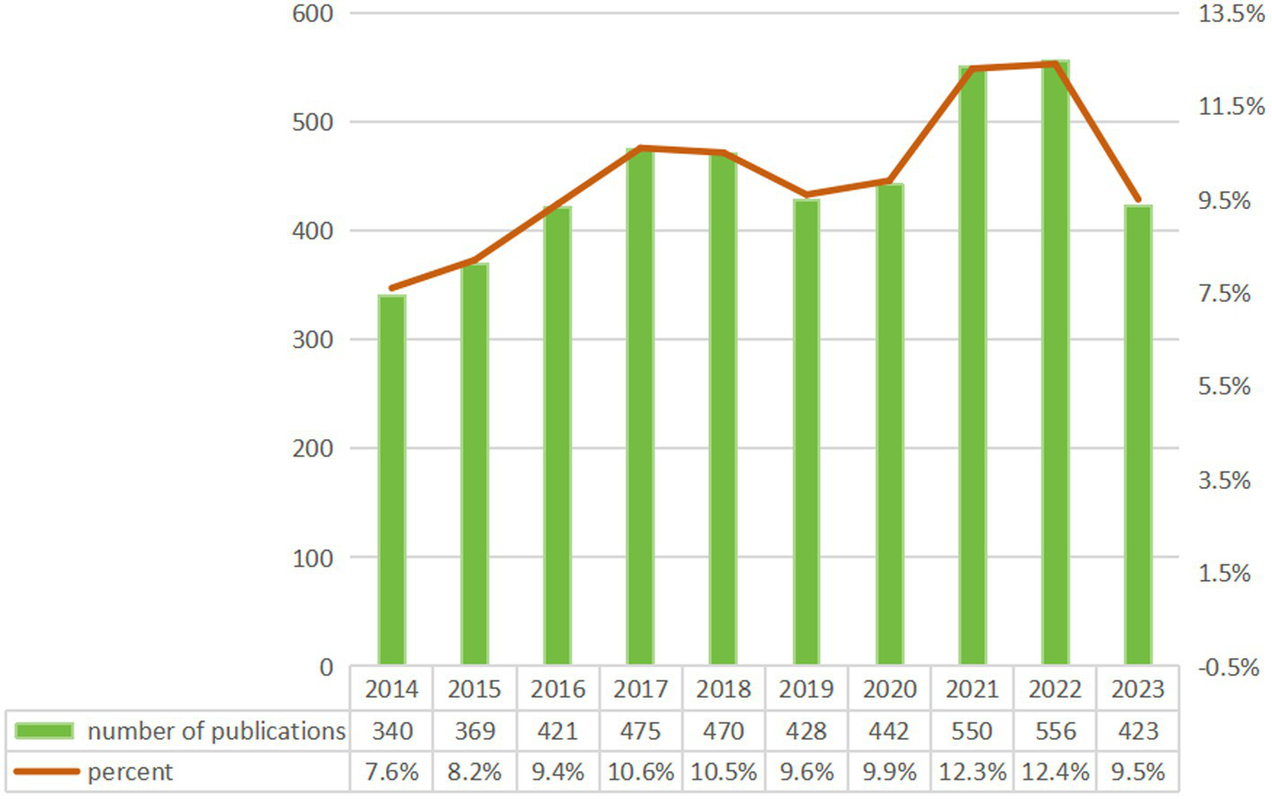 Our analysis identified 4,474 CSA-AKI related publications (2014–2023) from 776 journals in the WoSCC, comprising 3,786 (84.6%) original articles and 688 (15.4%) reviews. These works involved 21,406 authors affiliated with 17,394 institutions globally. As shown in Figure 2, annual publications exhibited steady growth over the decade – from 340 in 2014 to 569 in 2022 (67% increase). This marked rise reflects expanding research engagement with CSA-AKI, underscoring its growing clinical and scientific importance.