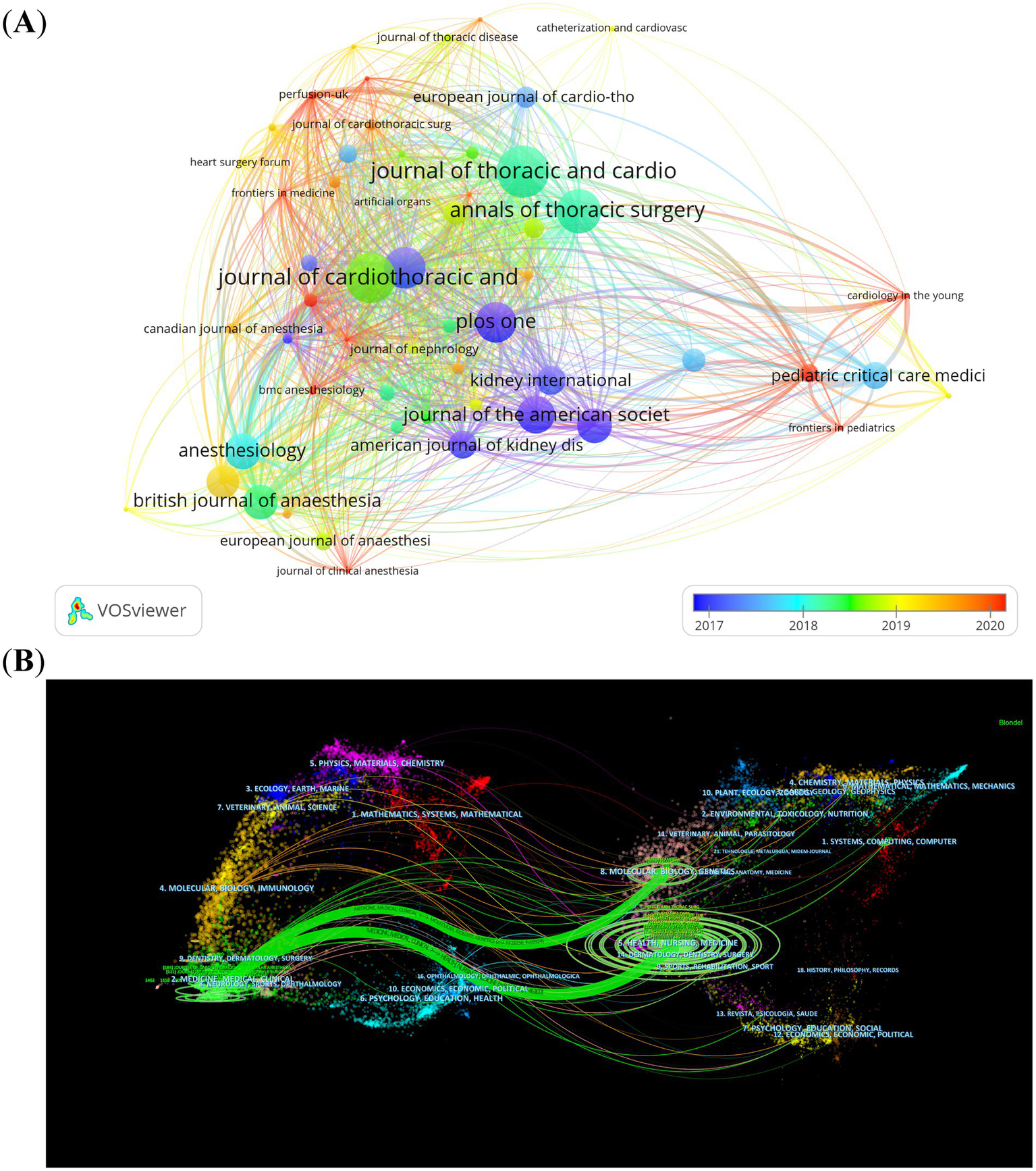 The visualization of journals (A) and dual-map overlay of journals (B) on research of CSA-AKI.