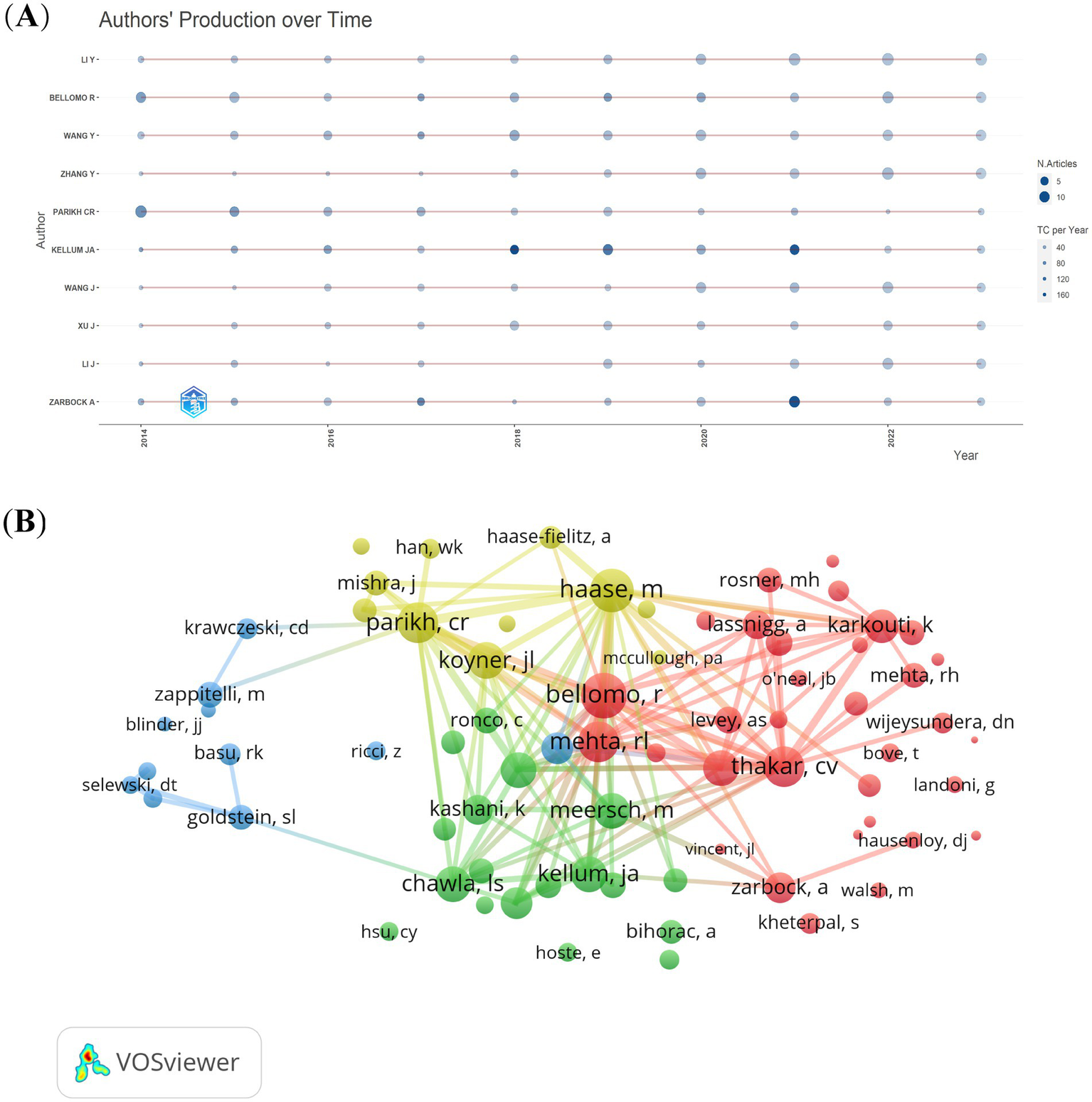 The authors’ production over time (A) and co-cited authors (B) on research of CSA-AKI.