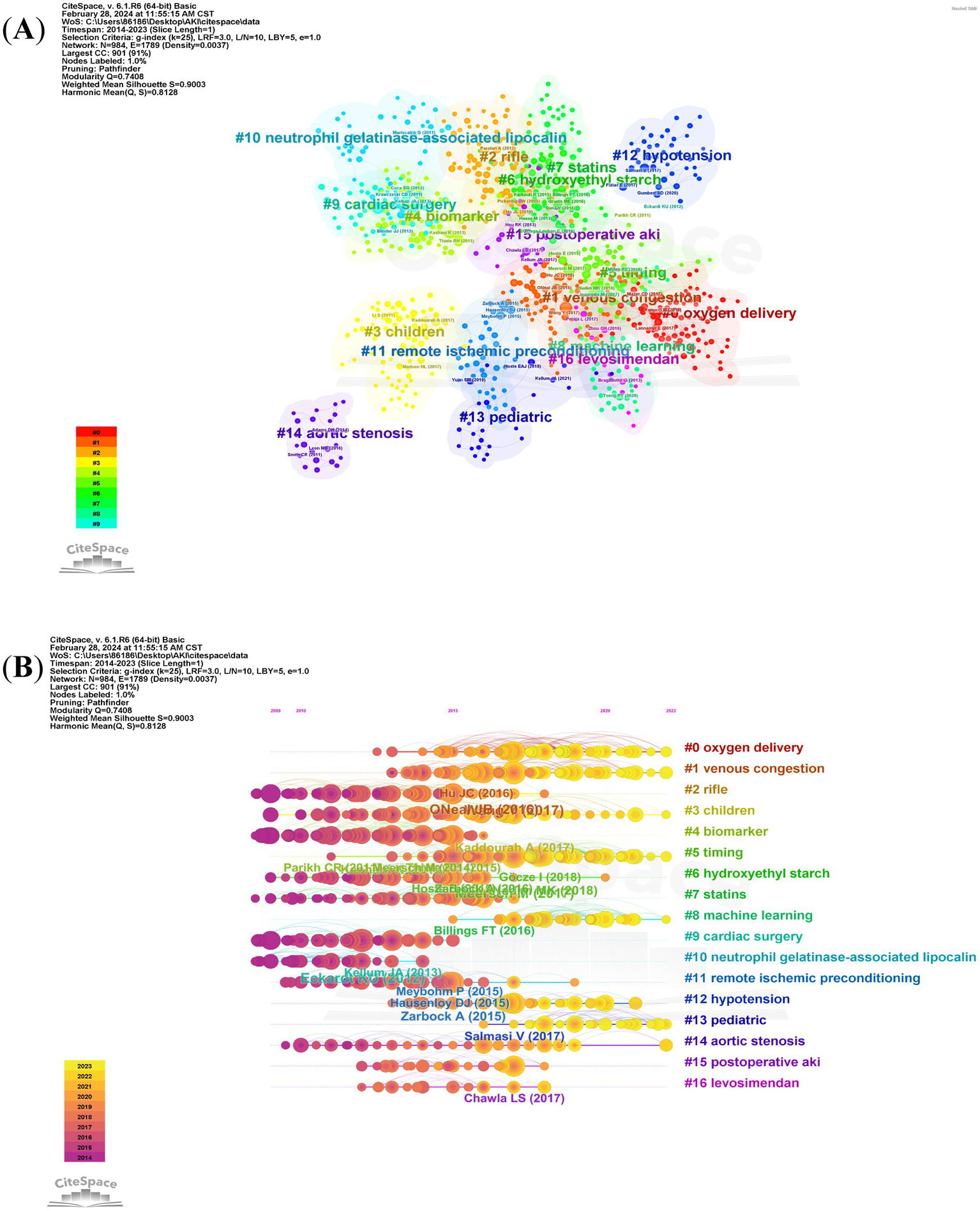 The reference co-citation and cluster network (A) and co-citation literature timeline map (B) on research of CSA-AKI.