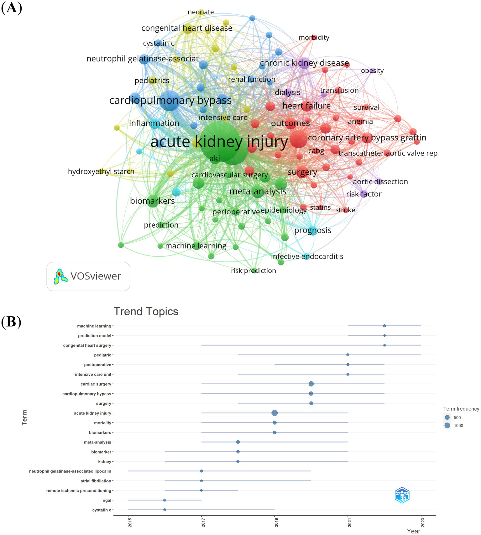 Annual publications increased steadily, with the USA and China leading productivity. The Journal of Cardiothoracic and Vascular Anesthesia serves as the foremost preferred journal within this domain. Critical Care (IF = 15.1) has the highest impact factor. Yunjie Li published the most papers. John A Kellum has the highest H-index. The definition, pathogenesis or etiology, diagnosis, prediction, prevention and treatment, which are the research basis in CSA-AKI. Machine learning (ML) and prediction models emerged as dominant frontiers (2021–2023), reflecting a shift toward personalized risk stratification and real-time perioperative decision-making. These advancements align with clinical demands for early AKI detection and precision prevention.