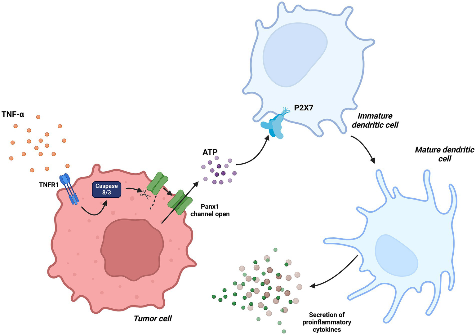 Dendritic Cells in tumor immunity associated with Panx1. In the context of chemotherapy-induced tumor immunity, TNF-α signaling activates caspase-3, which proteolytically processes Panx1, maintaining it in a constantly active state. This mechanism facilitates ATP release into the tumor microenvironment, promoting dendritic cell maturation through the activation of the P2X7 receptor. Created with BioRender.com.