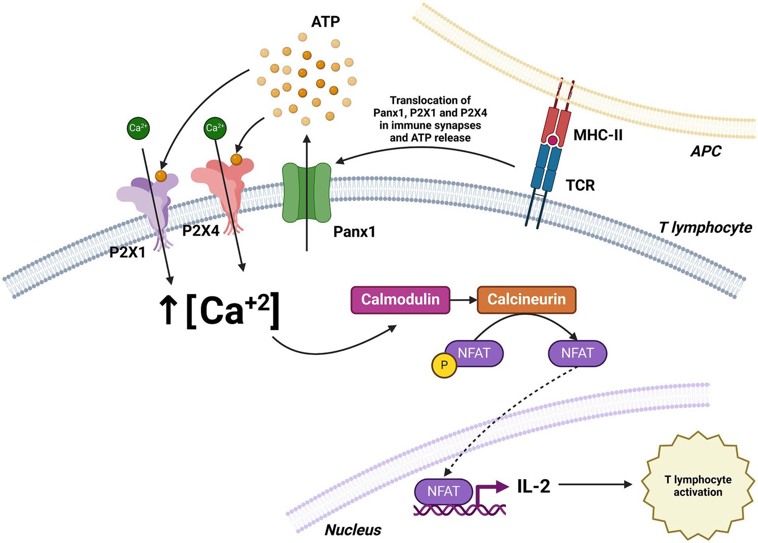 Role of Panx1 in T cell activation. T cell receptor (TCR) stimulation induces the translocation of Panx1, P2X1, and P2X4 to the immune synapse, facilitating ATP release and Ca2+ influx. The increase in intracellular Ca2+ concentration activates the calmodulin pathway, leading to enhanced IL-2 expression and T cell activation. Created with BioRender.com.