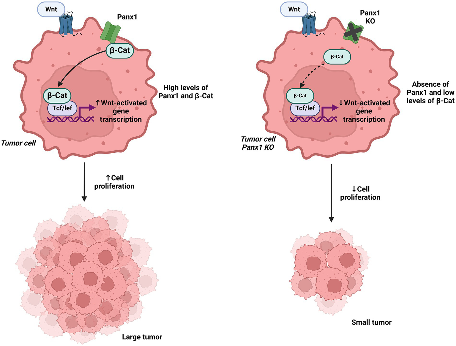 Interaction of Panx1 with β-catenin and its impact on Wnt signaling. In the left panel, Panx1 is shown to directly interact with β-catenin, regulating the Wnt signaling pathway and promoting tumor growth. In the right panel, Panx1 KO tumor cells exhibit reduced Wnt pathway activation, leading to decreased cell proliferation. Created with BioRender.com.