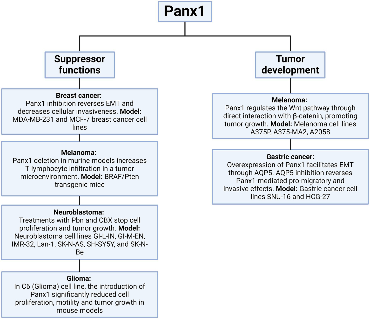 The impact of Panx1 also extends to gastric cancer, where its overexpression facilitates epithelial-mesenchymal transition (EMT) through the regulation of aquaporin 5 (AQP5), a critical mediator of signaling pathways involved in cell migration and invasion. In vitro models using gastric cancer cell lines revealed that AQP5 inhibition reverses the pro-migratory and invasive effects mediated by Panx1, further establishing the functional connection between these molecules in gastric cancer progression (64). In contrast to the tumor-promoting roles discussed earlier, some studies have suggested a potential tumor-suppressive function of Panx1 in specific contexts. For instance, in rhabdomyosarcoma, Panx1 re-expression not only decreased cell viability, inhibited migration, and promoted apoptosis, but also exhibited an inhibitory interaction with AHNAK, highlighting its role as a regulator of malignancy in this pediatric sarcoma (65). Similarly, in C6 glioma cells, Panx1 reintroduction significantly reduced cell proliferation, motility, and tumor growth in mouse models, indicating that its function may vary depending on cancer type and the surrounding microenvironment (52). This duality in Panx1 function could be influenced by tumor stage, molecular context, or interactions with specific proteins, such as AHNAK in rhabdomyosarcoma or β-catenin in melanoma (62, 65) (Figures 8, 9). Panx1 exerts complex, context-dependent roles in cancer, acting as both a promoter and suppressor of tumor progression depending on the tumor type and microenvironment. Its influence on EMT, immune evasion, and cell migration underscores its relevance as a potential therapeutic target. However, its dual behavior highlights the need for precise characterization before clinical application.