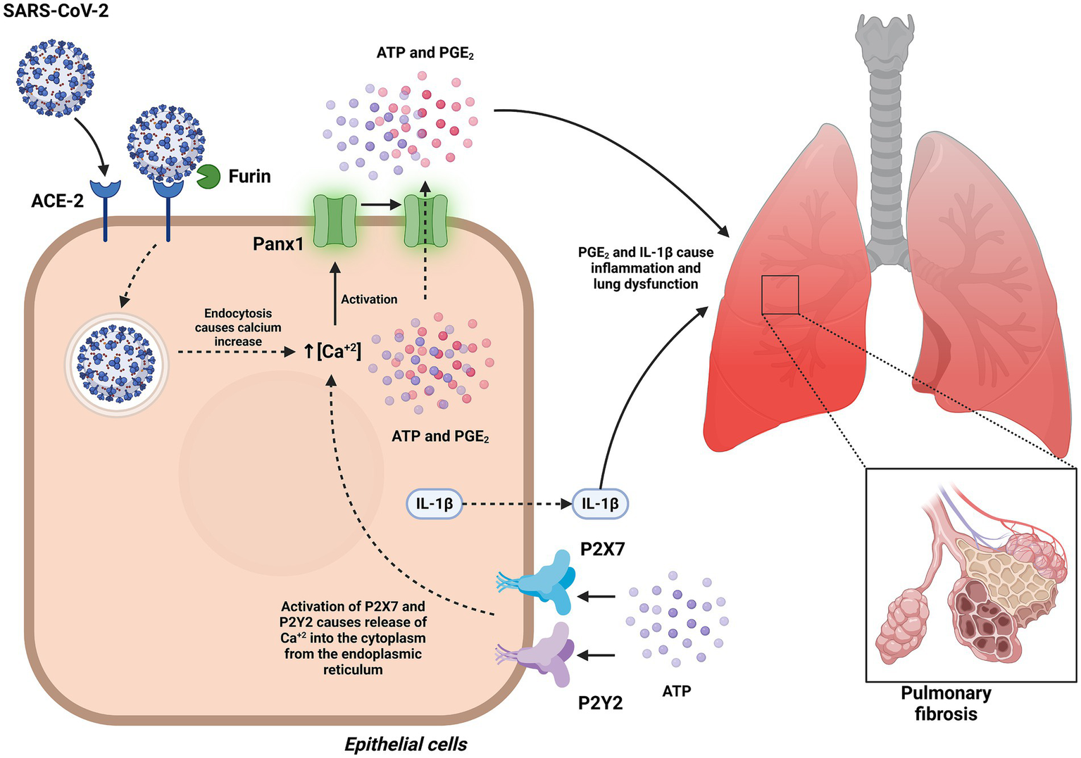 Panx1 has emerged as a key player in the pathogenesis of COVID-19, primarily by mediating ATP release into the extracellular space. This extracellular ATP functions as a danger-associated molecular pattern (DAMP), activating purinergic receptors such as P2X7 and P2Y2 and promoting downstream inflammatory responses. In the context of SARS-CoV-2 infection, the viral Spike S1 protein has been shown to induce sustained opening of Panx1 channels in human pulmonary epithelial cells, triggering the release of ATP, prostaglandin E2 (PGE2), and interleukin-1β (IL-1β). These events depend on interactions with the ACE2 receptor, the furin protease, and endocytosis, highlighting the role of Panx1 in exacerbating pulmonary inflammation and severe respiratory dysfunction observed in COVID-19 (26).