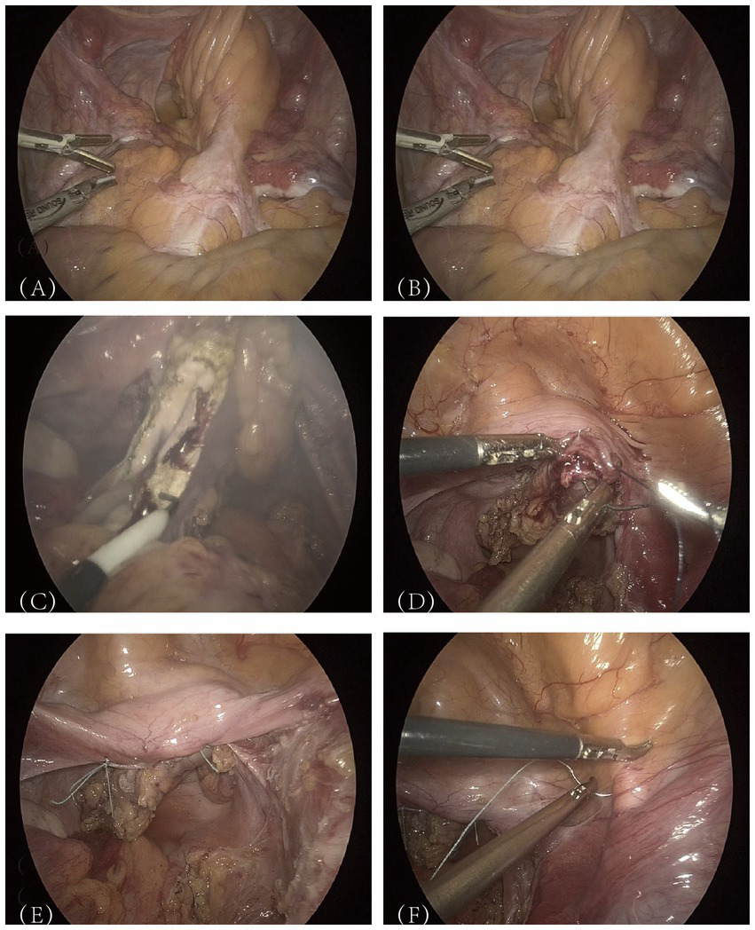 Following the completion of preoperative evaluations, the patient was informed of the potential risks associated with the surgical intervention and provided with an informed consent form. After ruling out surgical contraindications, the procedure—“laparoscopic vaginal suspension + laparoscopic partial vaginal resection + laparoscopic pelvic adhesion release”—was performed on July 24, 2024. The patient was placed in the lithotomy position, and following the induction of general anesthesia, the surgical field was routinely sterilized, and sterile drapes were applied. Intraoperative exploration of the pelvic and abdominal cavities revealed extensive “cobweb-like” adhesions, with the greater omentum extensively adhered to the upper abdominal wall peritoneum, covering the pelvic floor. The peritoneum and intestinal structures on both sides of the pelvic cavity were adherent, forming a dense membranous encapsulation around the bilateral fallopian tubes and ovaries. No space-occupying lesions were identified. First, perform adhesiolysis in the pelvic and abdominal cavities to restore normal anatomy. A meticulous examination of the neovagina revealed that the sigmoid colon, approximately 22 cm in length, had been used as a vaginal substitute and exhibited dense adhesions with the surrounding tissues (Figure 2A). Further adhesiolysis was performed with meticulous identification and preservation of the ureters. The neovaginal bowel segment was mobilized and its blind end was exposed (Figure 2B). The mesentery surrounding the neovaginal bowel was progressively divided toward the pelvic floor. After isolating and transecting the relevant mesenteric blood vessels, approximately 8 cm of the neovaginal bowel segment was preserved, and the remainder was resected (Figure 2C). The inter-uterine strip structure was firm and provided adequate support, making autologous tissue suspension feasible without the need for synthetic mesh. During the procedure, the patient’s family was consulted, and a decision was made not to use mesh reinforcement. The severed end of the neovaginal bowel segment was closed with 1-0 absorbable suture (Figure 2D). It was then sutured to the bilateral rudimentary uterine horns using 1-0 non-absorbable braided polyester suture (Figure 2E). Following reinforcement, the neovagina was further suspended to the iliopubic ligaments (Figure 2F). The final measured vaginal depth was approximately 10 cm.