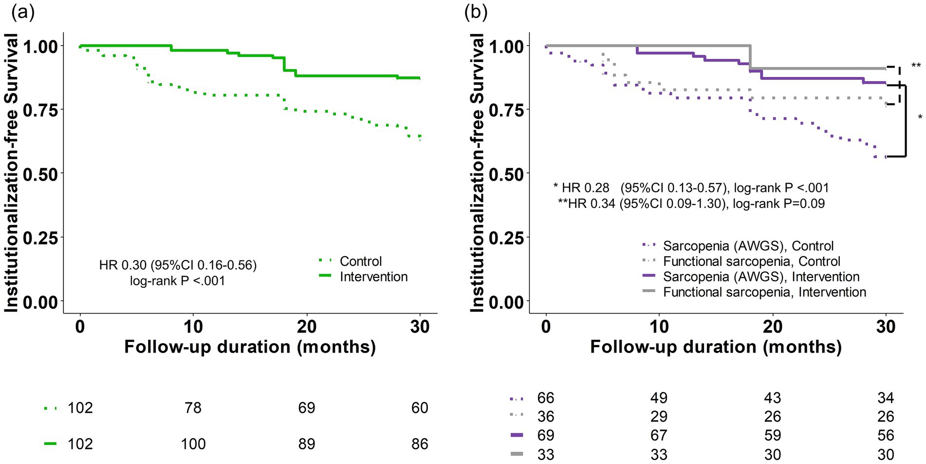 Institutionalization-free survival was determined using Kaplan–Meier estimates. To examine the statistical differences in survival and hazard between the intervention and comparison groups, we employed the log-rank test and Cox proportional hazard model. Additionally, a subgroup analysis was performed by categorizing participants into two groups based on the presence or absence of low muscle mass, classified as sarcopenia (AWGS) and functional sarcopenia.