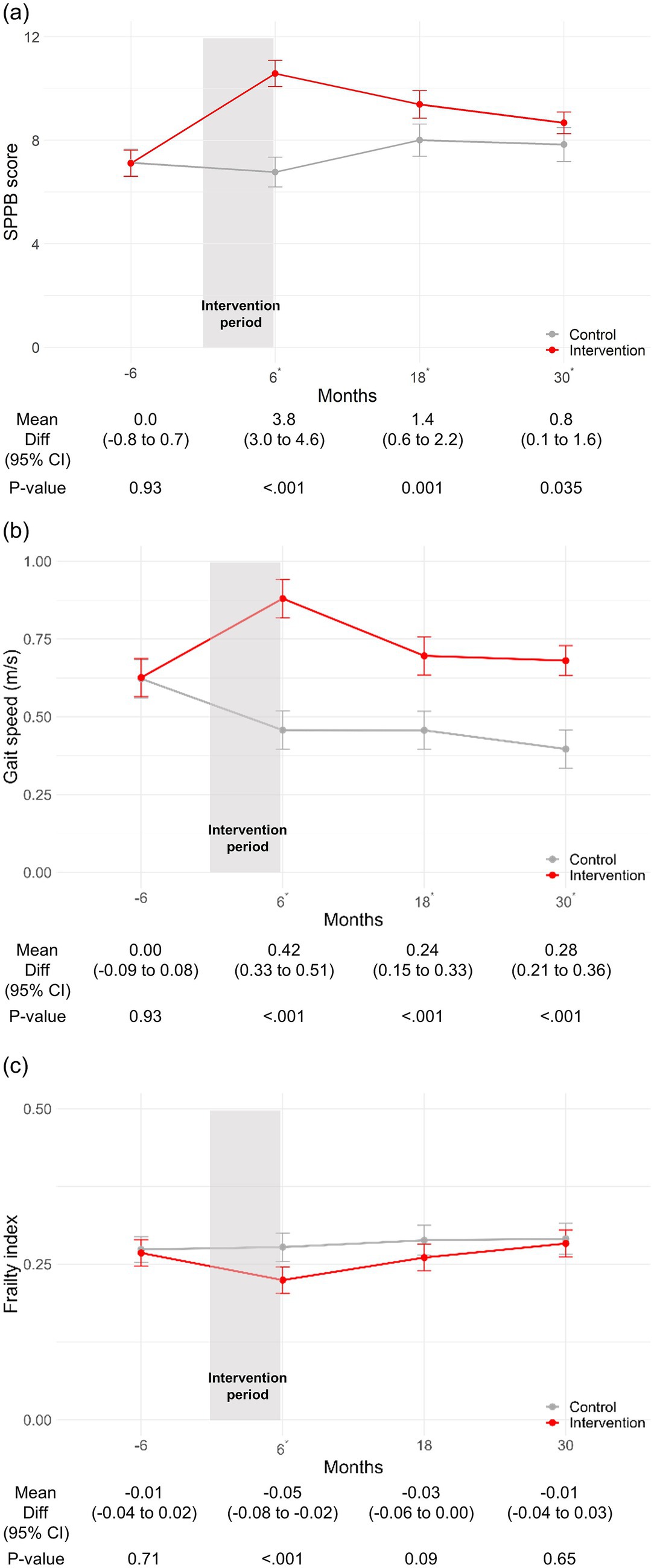 Figure 2. Change in SPPB score, gait speed, and frailty index stratified by intervention status. (a) Change in SPPB score. (b) Change in gait speed (m/s). (c) Change in frailty index. *p-value <0.05. CI, confidence interval; SPPB, short physical performance battery.