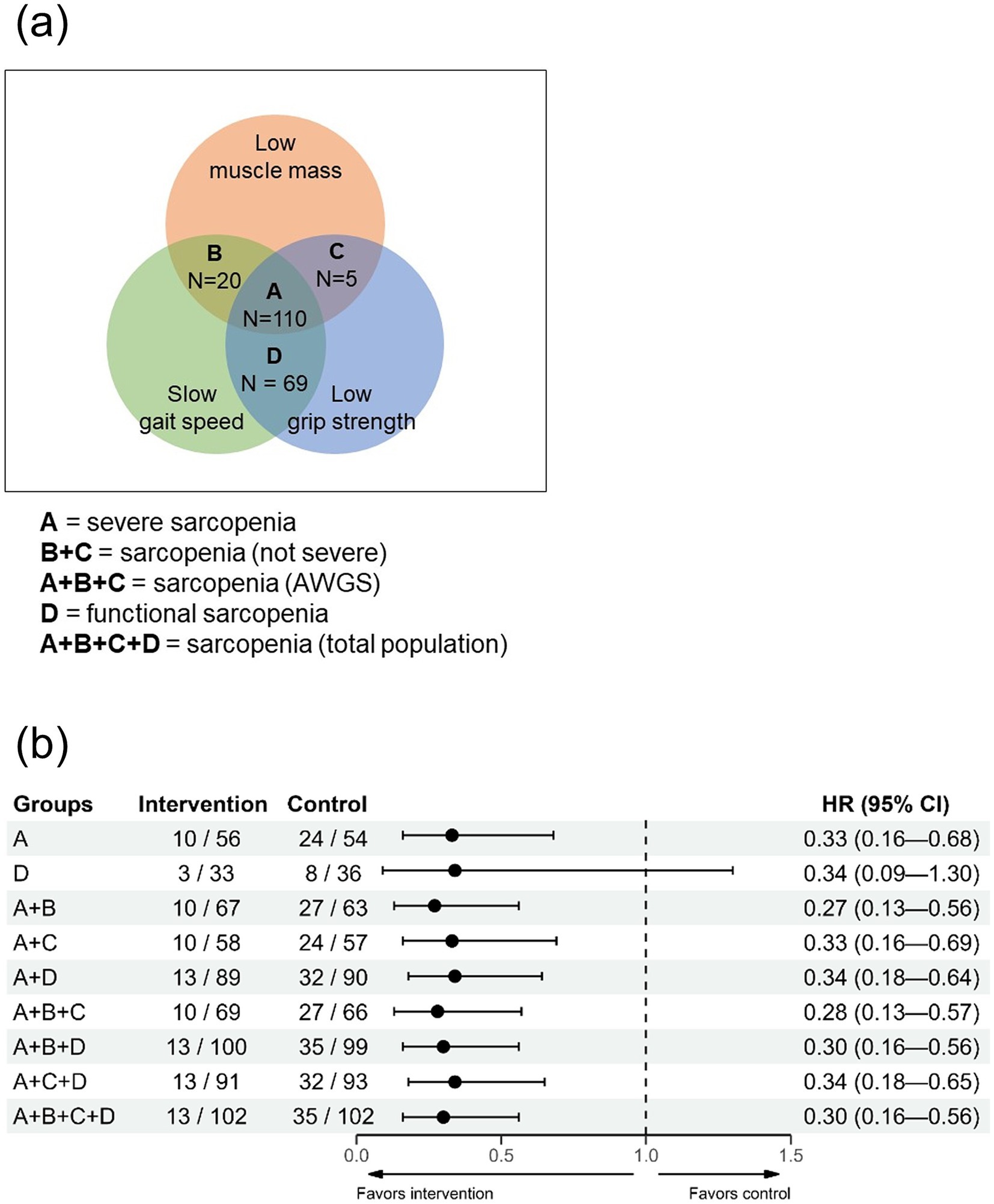 Figure 3. Impact of multicomponent intervention on institutionalization-free survival based on different sarcopenia component combinations (Analysis of Group B or C alone could not be performed due to insufficient data.). (a) Venn diagram illustrating study populations and Groups A, B, C, and D. (b) Sensitivity analysis examining the effect of multicomponent intervention on institutionalization-free survival across various combinations of Groups A, B, C, and D. AWGS, Asian Working Group for Sarcopenia; CI, confidence interval; SPPB, short physical performance battery.