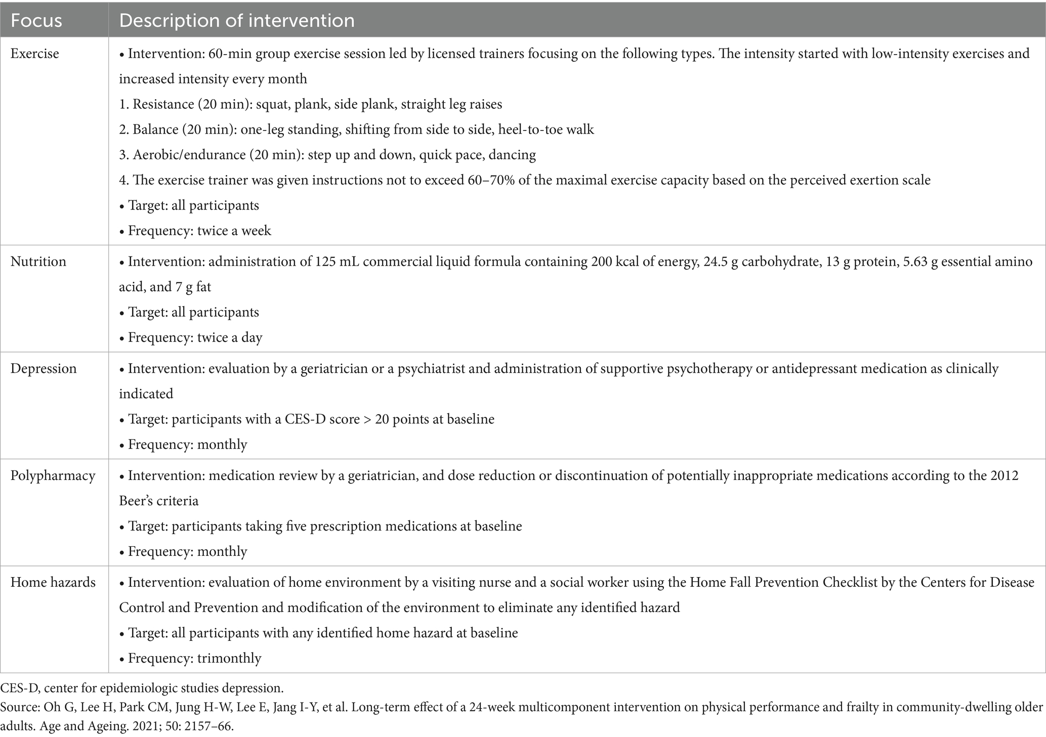 23. Park, CM, Oh, G, Lee, H, Jung, HW, Lee, E, Jang, IY, et al. Multicomponent intervention and long-term disability in older adults: a nonrandomized prospective study. J Am Geriatr Soc. (2021) 69:669–77. doi: 10.1111/jgs.16926
