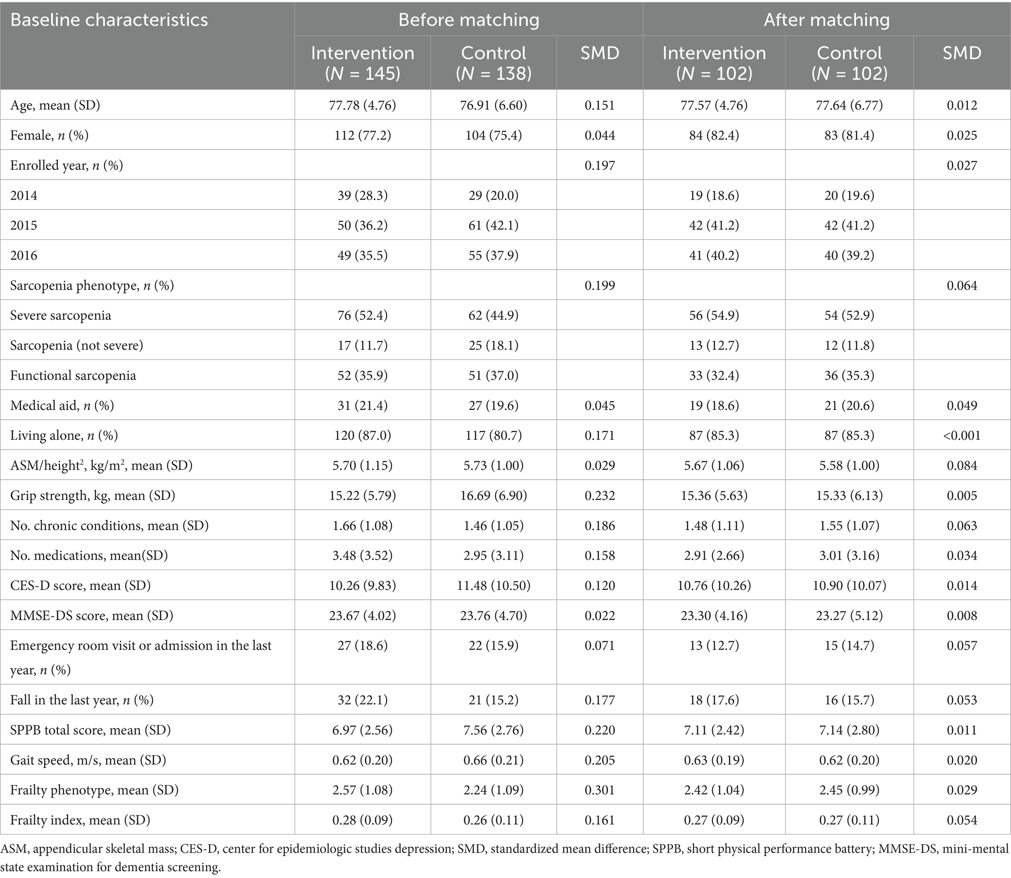 Participants: A total of 283 older adults with sarcopenia were included, with 145 in the intervention group and 138 in the control group. After propensity score matching, 102 pairs were analyzed. The mean age was 77.57 years (intervention) and 77.64 years (control), with 82.4 and 81.4% females in each group, respectively.