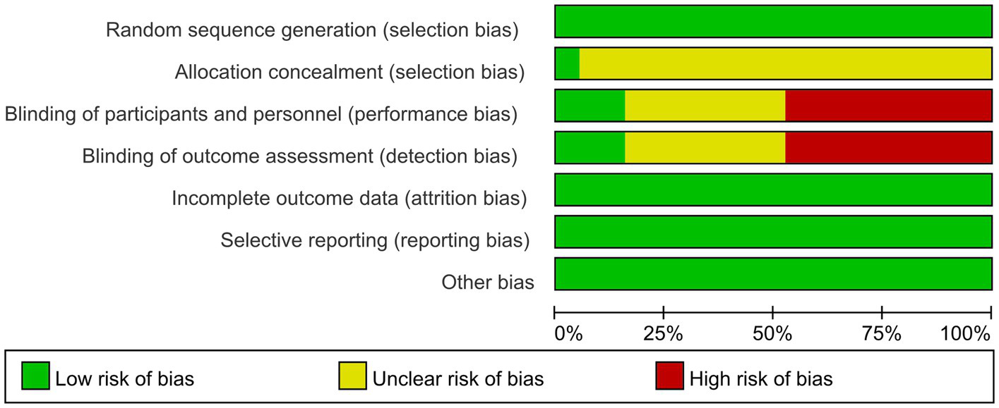 In this study, two independent researchers (H.Z.L. and M.Q.C.) utilized the risk of bias tool developed by the Cochrane Collaboration to conduct a quality assessment. The assessment criteria included random allocation methods, allocation concealment, blinding of assessors, integrity of outcome data, selective reporting, and other potential biases.