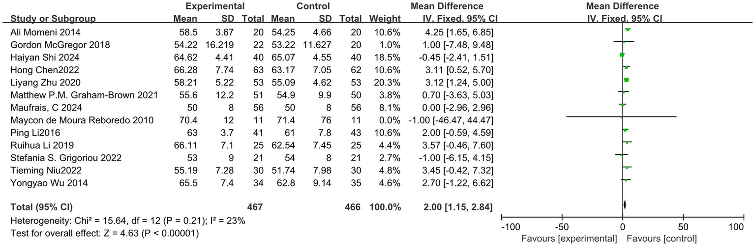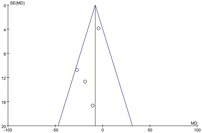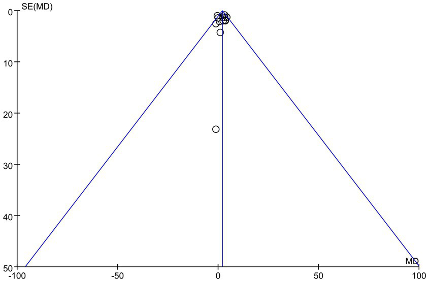 This article utilized RevMan Manager 5.4 to conduct a meta-analysis of more than two randomized controlled trials with identical outcome indicators. The mean difference (MD) was used as the effect measure, and its 95% confidence interval (CI) was calculated simultaneously. The p-value for the combined statistics was determined using the Z test, with P domized controlled trials with identical outcome indigeneity of the research data was assessed using the I2 statistic. If p > 0.1 and I2 < 50%, it indicated no heterogeneity or low heterogeneity, and the fixed-effect model was employed to calculate the combined effect size. Conversely, if p ≤ 0.1 and I2 ≥ 50%, it indicated high heterogeneity, prompting the use of the random-effects model to compute the combined effect size. In instances of significant heterogeneity, subgroup analyses were conducted. A sensitivity analysis was performed on the included literature by systematically removing one study at a time, comparing the changes in I2 values before and after each removal, and assessing the stability of the results. Publication bias was evaluated using a funnel plot. The quality of evidence was assessed using the Grading of Recommendations Assessment, Development, and Evaluation (GRADE) framework for pairwise meta-analysis.
