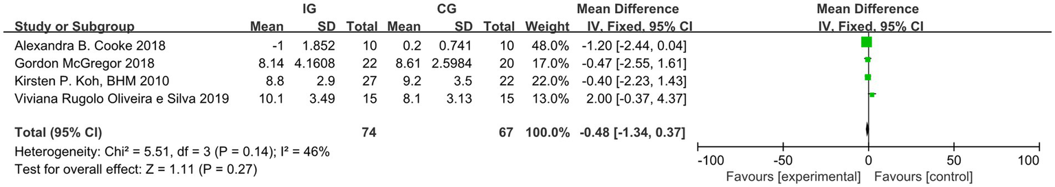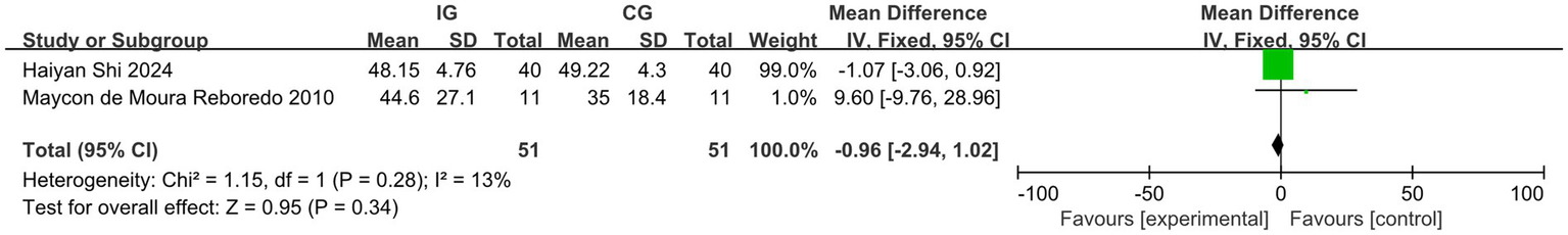 | Liyang Zhu 2020 (29) | China | 106 (53/53) | IG:46.8 ± 13.72 CG:47.4 ± 12.57 | IG:13.41 ± 5.66 CG:14.87 ± 4.89 |