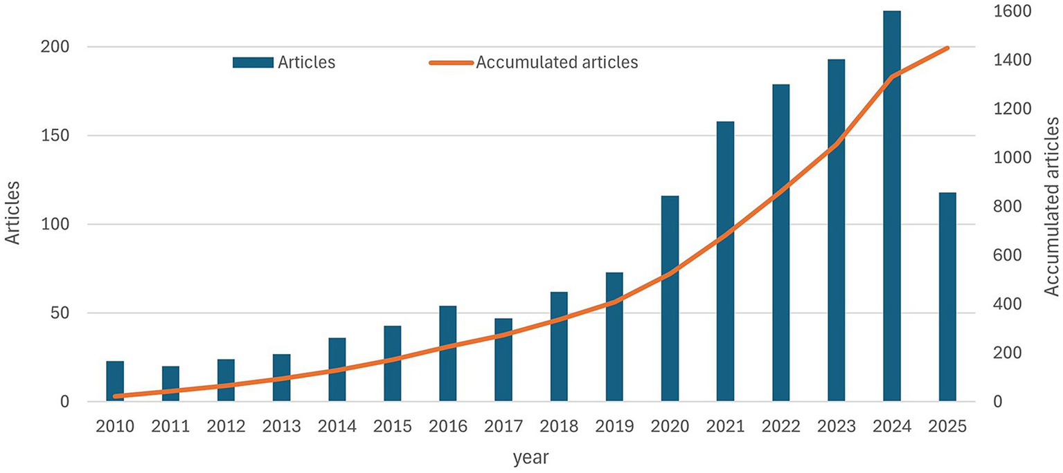 From 2010 to May 1, 2025, 1,449 publications on ovarian cancer immunotherapy were retrieved, spanning 15 years. Figure 2 illustrates the annual and cumulative number of articles on this topic. A growth rate of 11.52% was observed. From 2010 to 2019, the cumulative number of publications steadily increased from 23 to 409. In the subsequent 5 years, from 2019 to 2024, there was a rapid surge in publication output, with the cumulative total reaching 1,449 by May 1, 2025.