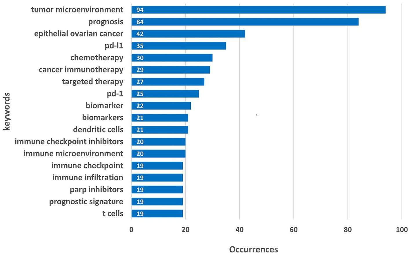 The top 20 most-used keywords (eliminated ovarian cancer and immunotherapy).