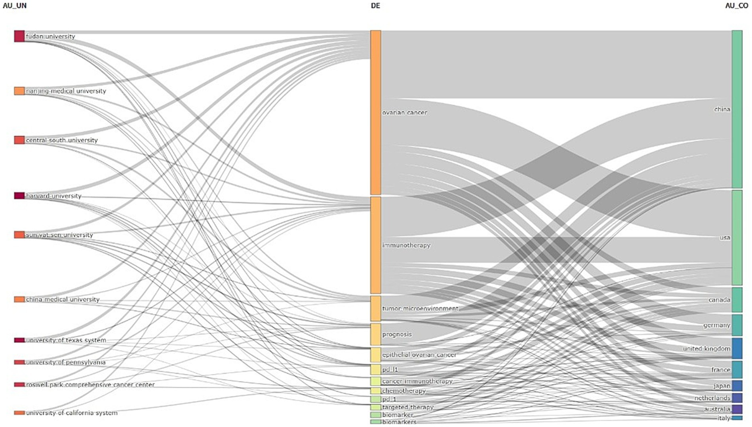 The three-field plot of the keywords plus analysis on ovarian cancer immunotherapy. (Left field: institutions; Middle field: keywords; Right field: countries).